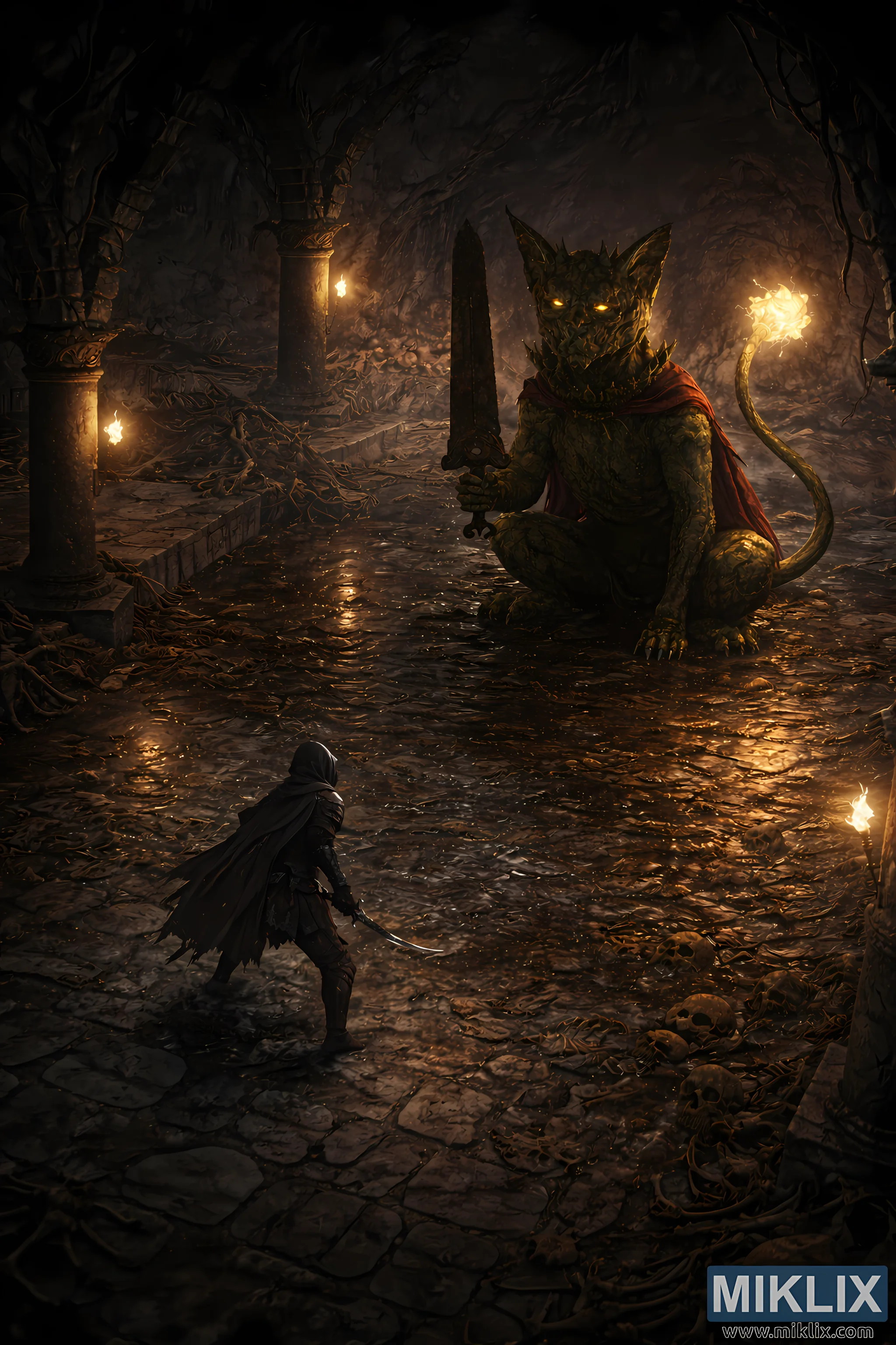 The environment plays a critical role in shaping the atmosphere. Thick stone pillars rise along the edges of the hall, their surfaces eroded and etched with faint, ancient patterns. Wall-mounted torches emit warm amber flames that flicker across damp rock walls, producing layered shadows that stretch toward the center of the room. The floor is uneven and partially submerged beneath shallow water, which mirrors the torchlight, the glowing tail of the Watchdog, and fragments of the ceiling above. Bones, skulls, and broken masonry are scattered across the flooded ground, suggesting the long and perilous history of the catacombs.
