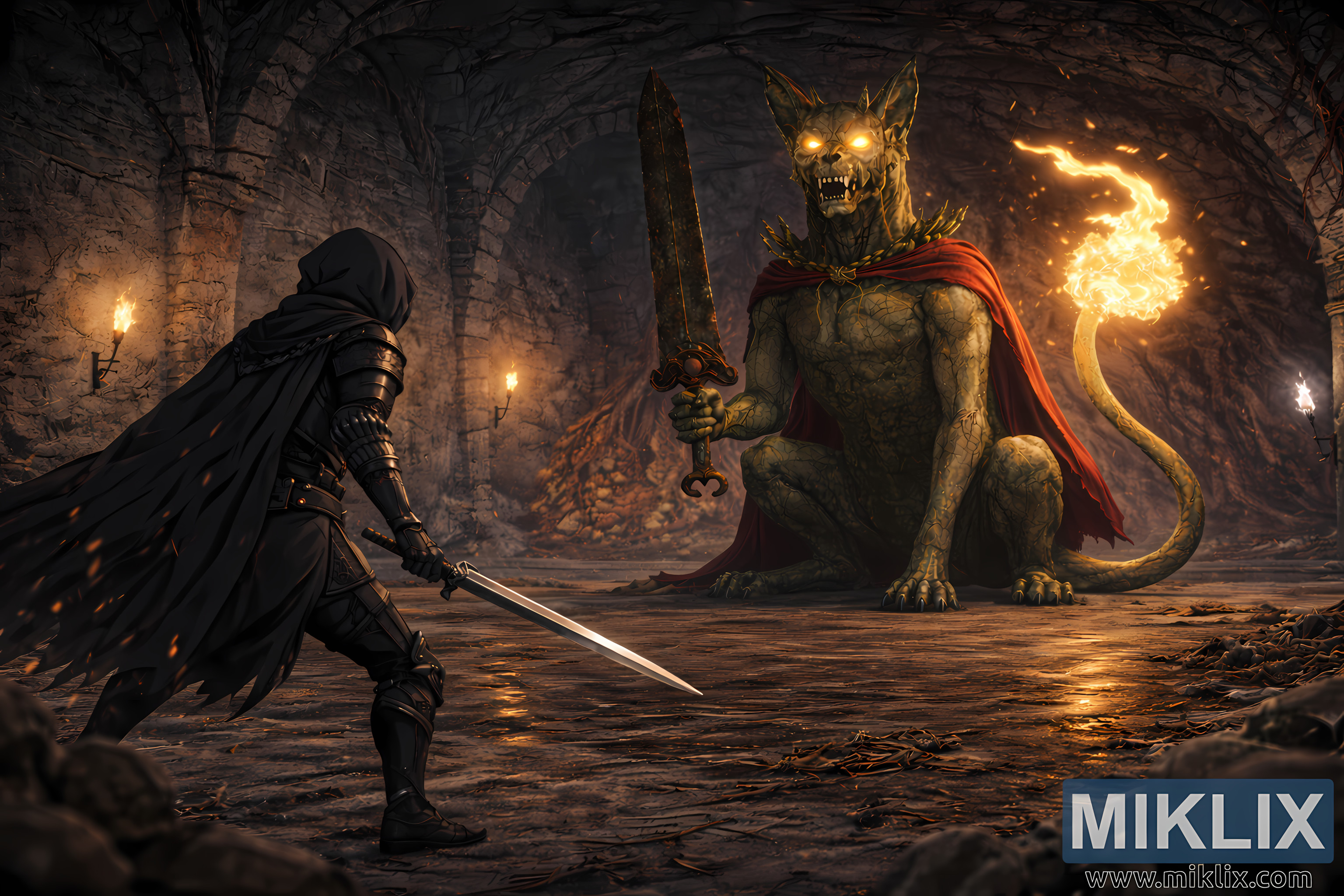 Wide cinematic anime fantasy illustration of a cloaked warrior confronting a towering stone watchdog boss inside an ancient torch-lit dungeon moments before battle.