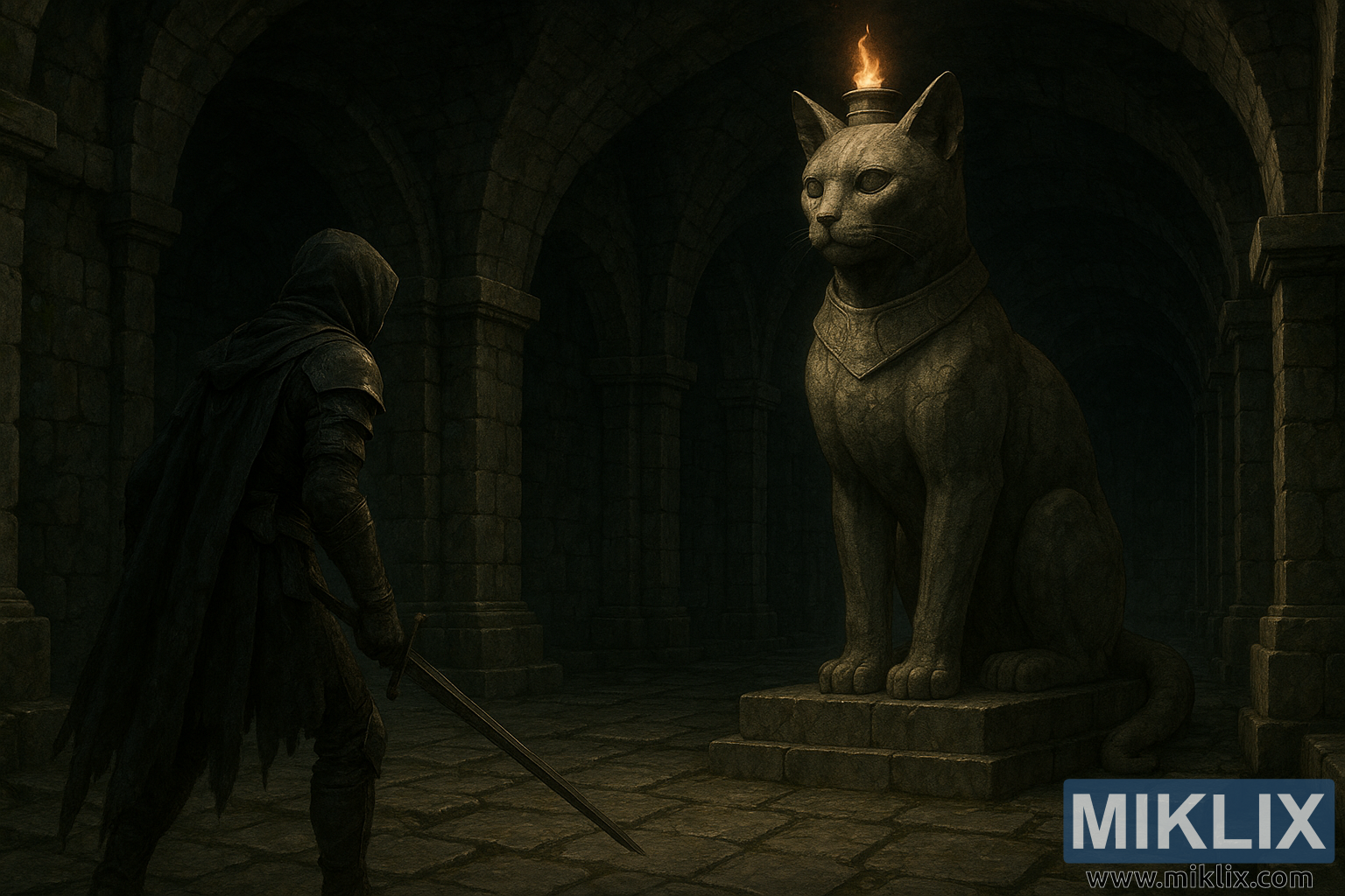 Opposite the Tarnished, dominating the right side of the chamber, sits the Erdtree Burial Watchdog, depicted here as a monumental stone cat statue. The Watchdog is perfectly still, carved in a dignified seated pose atop a raised stone plinth. Its front paws rest symmetrically together, its spine straight, and its tail curves neatly along the base of the pedestal. The statue’s proportions are imposing, towering over the Tarnished and emphasizing the imbalance between mortal and ancient guardian. Its stone surface is textured with fine cracks, chipped edges, and subtle discolorations, giving it the unmistakable presence of something carved long ago and left to endure in silence.