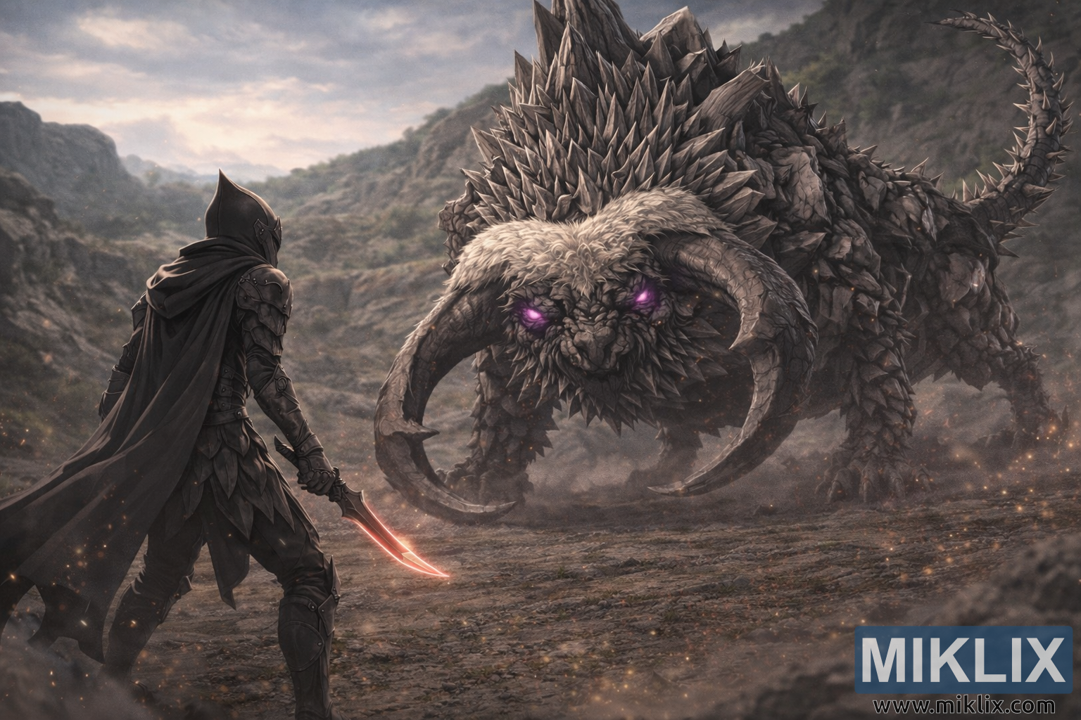 Opposite the Tarnished, dominating the right side of the scene, is the Fallingstar Beast—an enormous, alien monstrosity whose sheer size immediately establishes the imbalance of power. Its body is massive and low to the ground, built from jagged stone-like plates and crystalline spikes that jut outward in all directions like a living meteor. The creature’s head is crowned with thick, pale fur and framed by two colossal, scythe-shaped mandibles that curve forward menacingly. From within the shadowed recesses of its face, glowing violet eyes lock onto the Tarnished, radiating a cold, otherworldly intelligence and barely contained violence.