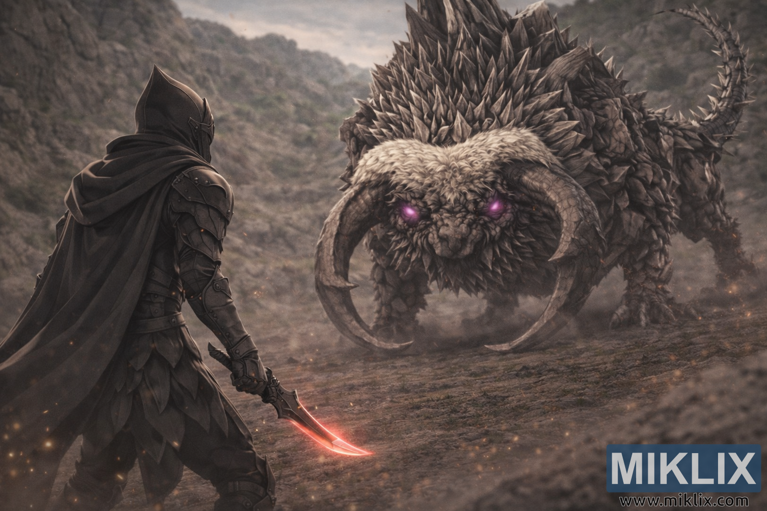 The environment surrounding them is harsh and unforgiving. The ground is uneven and rocky, scattered with dust and debris disturbed by the beast’s immense weight. Fine particles and ember-like motes drift through the air, catching the dim light and adding a sense of motion to the otherwise frozen moment. In the background, steep, eroded cliffs and distant hills enclose the battlefield, creating a natural arena that feels isolated and inescapable. Overhead, a heavy, cloud-laden sky diffuses the light into soft grays and browns, casting gentle shadows that further emphasize the Fallingstar Beast’s overwhelming size.
