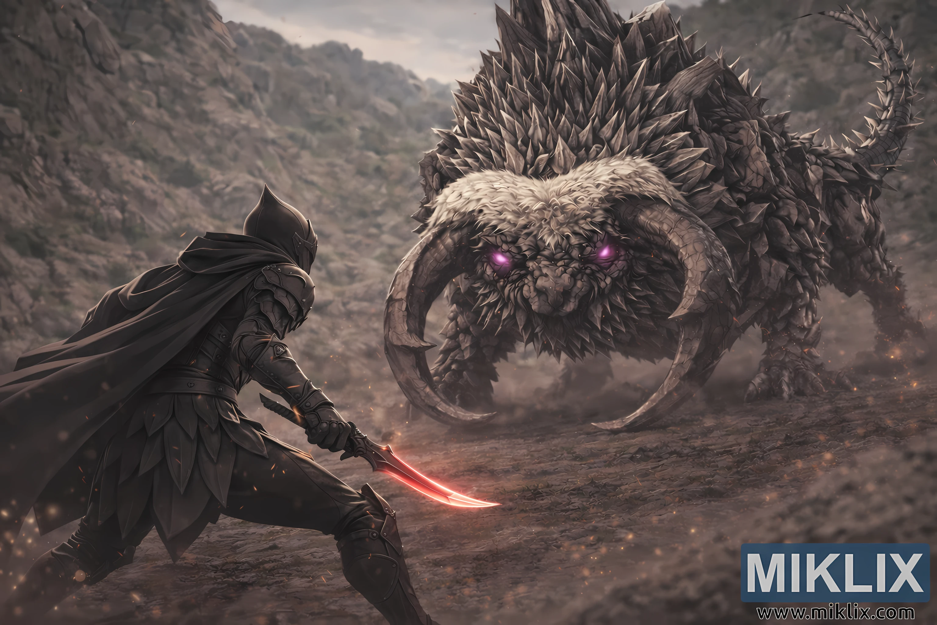 Compositionally, the image emphasizes the imbalance between human and monster. The Tarnished, though determined and resolute, appears small and fragile compared to the towering bulk of the Fallingstar Beast. Yet the glowing weapon and the warrior’s unwavering stance suggest defiance rather than fear. The moment feels frozen at the threshold between action and consequence, capturing the essence of Elden Ring’s themes: perseverance against overwhelming odds, the beauty found in ruin, and the quiet heroism of standing one’s ground in a world that is vast, hostile, and indifferent.