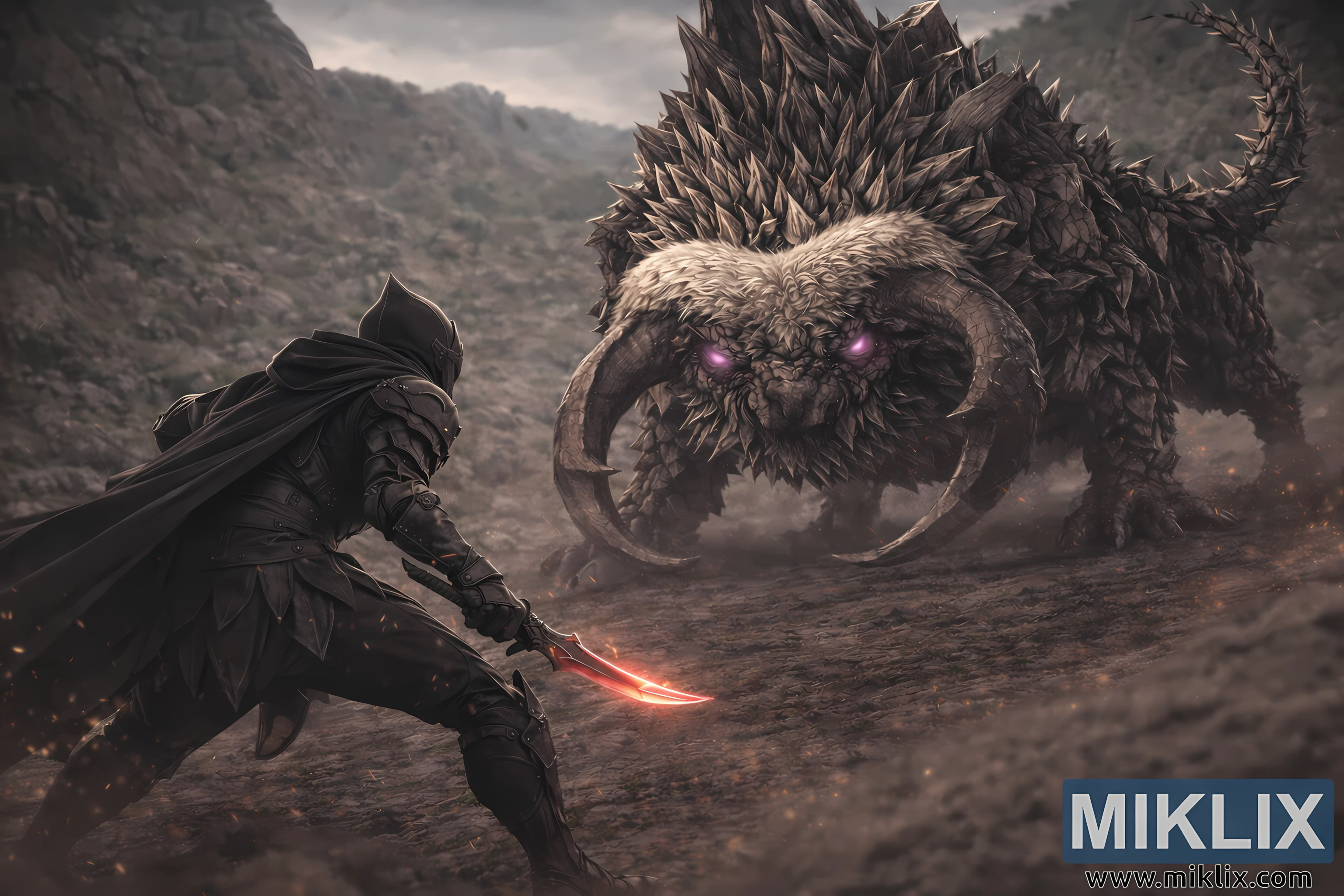 Cinematic Elden Ring fan art showing a grounded, realistic confrontation between the Tarnished and a colossal Fallingstar Beast in the desolate Hinterland moments before battle.