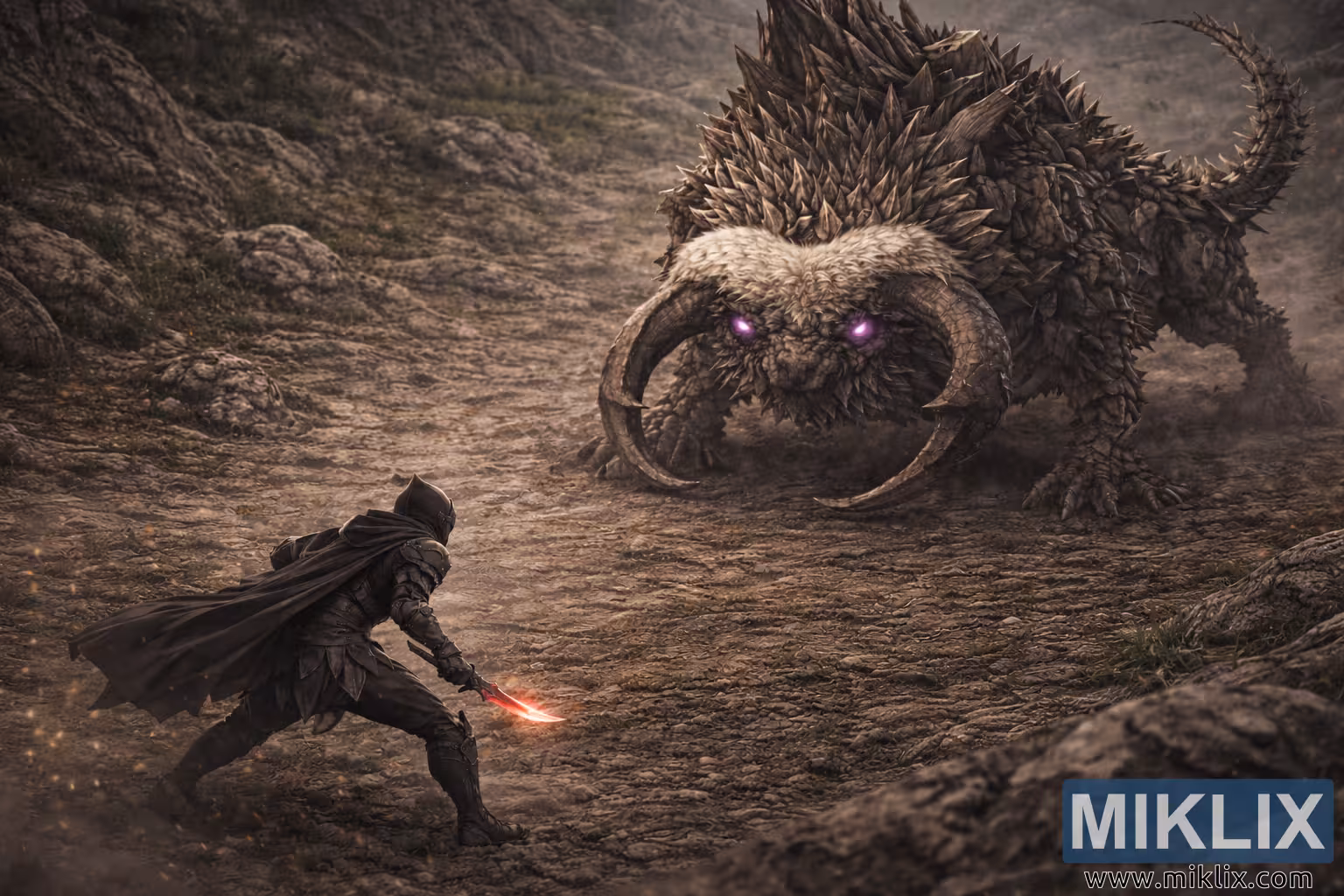 The environment plays a critical role in the composition. The Hinterland is depicted as a barren, uneven basin of cracked earth, scattered stones, and worn paths, bordered by eroded cliffs and rocky outcrops that slope upward into the distance. From the higher viewpoint, the terrain’s contours and elevation changes become more visible, reinforcing the sense of a natural arena shaped by time and violence. Fine dust and small glowing particles drift across the scene, adding subtle motion and atmosphere. Above, a heavy, overcast sky casts diffuse light across the battlefield, softening shadows while still emphasizing the Fallingstar Beast’s massive form.