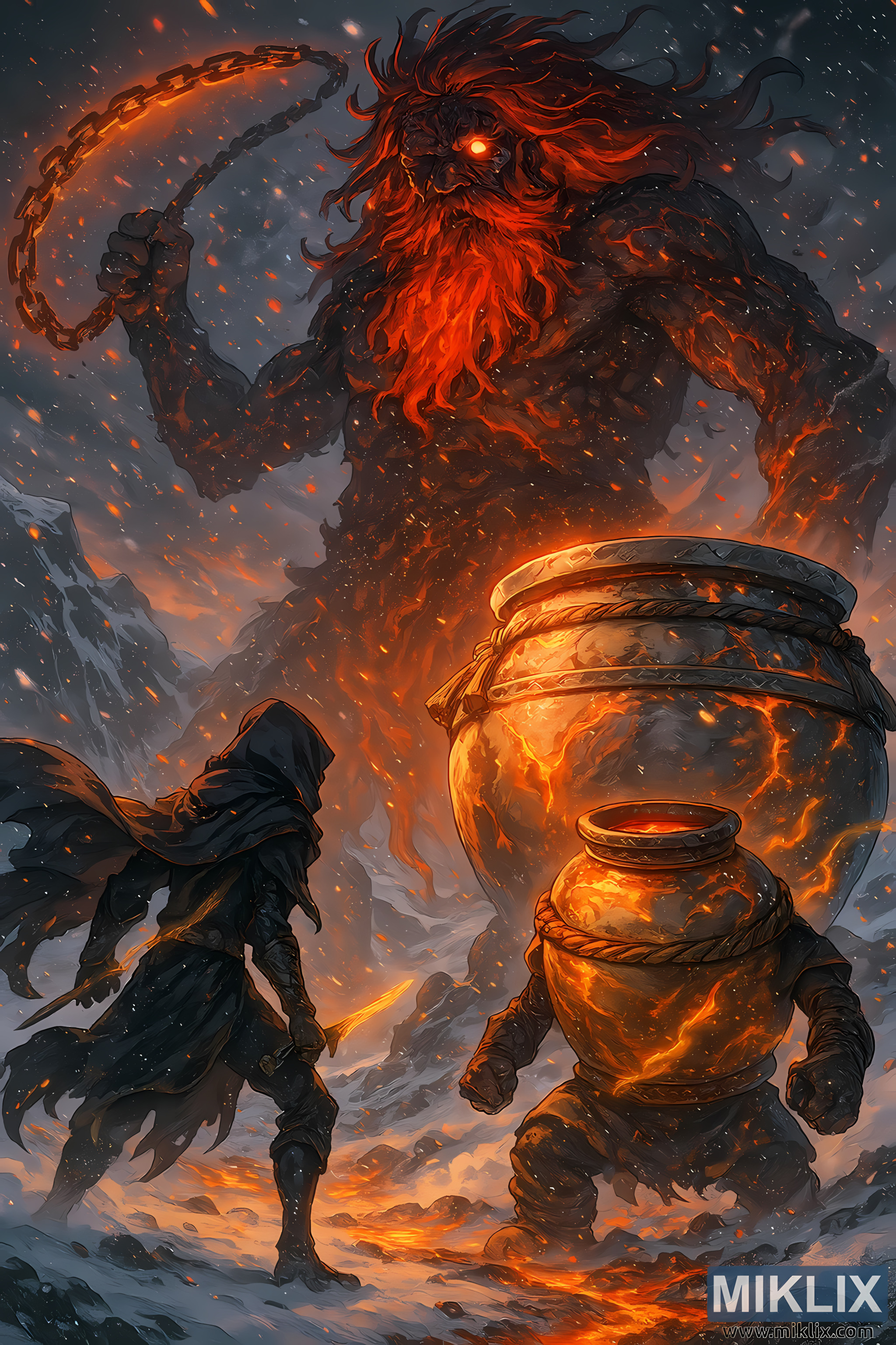 The environment is a stark contrast of elements: cold blue shadows from the snow juxtaposed against the fiery orange-red glow of the Fire Giant and lava fissures beneath the melting snow. Jagged peaks rise in the distance under a stormy sky streaked with smoke and flame. The lighting is dramatic and realistic, with firelight casting long shadows and illuminating the swirling particles in the air.