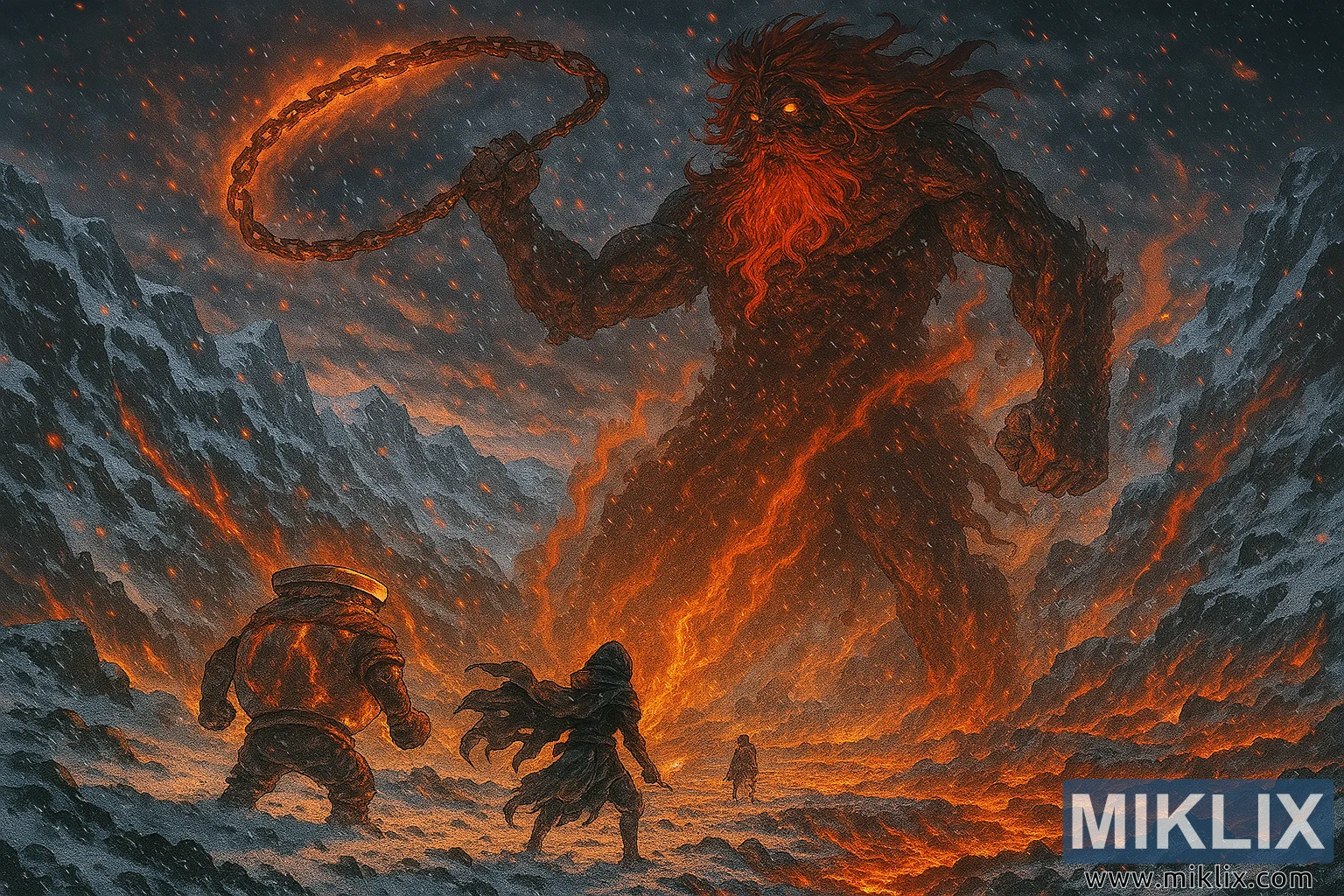 The lighting of the scene is dramatic and layered. The Fire Giant’s fiery glow bathes the battlefield in warm reds and oranges, while the snow and storm clouds reflect cold blues and grays. This interplay of light and shadow heightens the sense of contrast between fire and ice, destruction and resilience. Sparks, embers, snowflakes, and smoke fill the air, creating a sense of motion and chaos that makes the moment feel alive.
