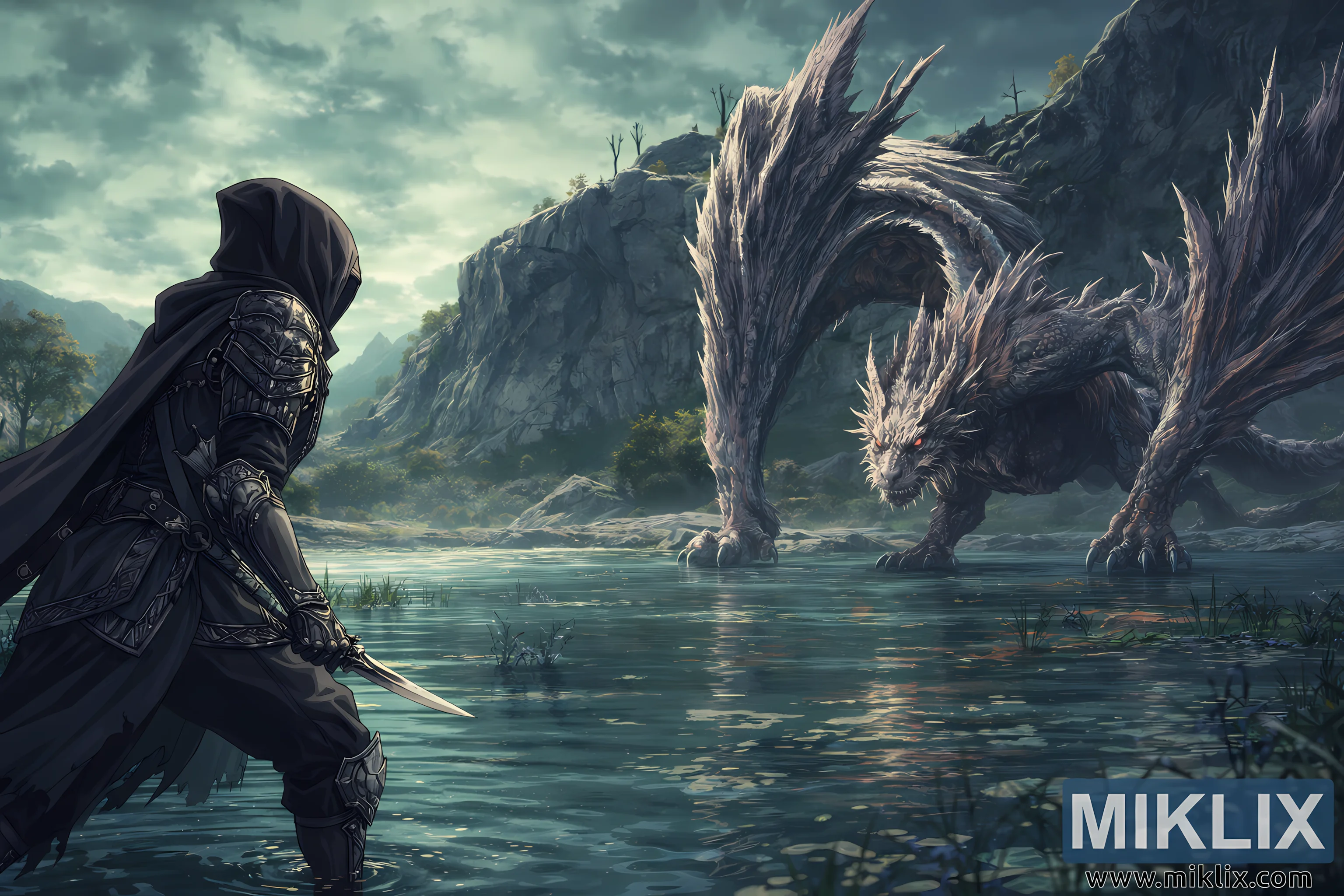 A cinematic anime-style fan art scene unfolds across the shallow reflective waters of Lake Agheel, capturing a tense pre-battle standoff between the lone Tarnished warrior and the colossal Flying Dragon Agheel. The composition is presented in a wide landscape orientation, emphasizing scale and atmosphere. In the foreground to the left stands the Tarnished, clad in the sleek and shadowed Black Knife armor set, the dark hood draping over their head and partially obscuring their face in mystery. The armor’s intricate metallic engravings and layered leather textures catch faint glimmers of ambient light, while a slim dagger is held low but ready in their right hand, its polished blade reflecting the dragon’s fiery glow. Their stance is cautious yet resolute, knees slightly bent, cloak trailing gently behind as if stirred by a distant wind. Across the water to the right dominates the immense form of Flying Dragon Agheel, its body towering over the environment with powerful limbs planted in the lakebed. The dragon’s scales are rendered with fine detail, each plate rugged and weathered, transitioning in tones from ash gray to muted bronze along the spine. Vast wings arc upward and outward like jagged sails, their membranes thin and battle-scarred, silhouetted against a turbulent green-tinged sky. Agheel’s glowing crimson eyes lock onto the Tarnished, and faint embers flicker between its partially opened jaws, hinting at imminent flames without yet unleashing them. The lake itself mirrors both figures in rippling reflections, broken by reeds and small clusters of marsh grass that protrude from the shallow water. Surrounding cliffs and rocky outcroppings frame the confrontation, their rough surfaces softened by distant mist and sparse, leafless trees that claw at the skyline. The sky above is heavy with storm clouds swirling in shades of teal, gray, and sickly green, suggesting an approaching tempest and heightening the dramatic tension. Light filters unevenly through the clouds, casting a moody gradient across the scene and contrasting the Tarnished’s cool shadowed silhouette with the dragon’s warm fiery highlights. The overall mood is suspenseful and anticipatory, freezing the exact moment before violence erupts—two forces measuring one another in silence, bound by destiny and danger. Fine anime linework, painterly shading, and dynamic lighting combine to create a vivid sense of depth, motion, and scale, transforming the iconic encounter into a dramatic illustrated tableau that balances elegance with raw power.
