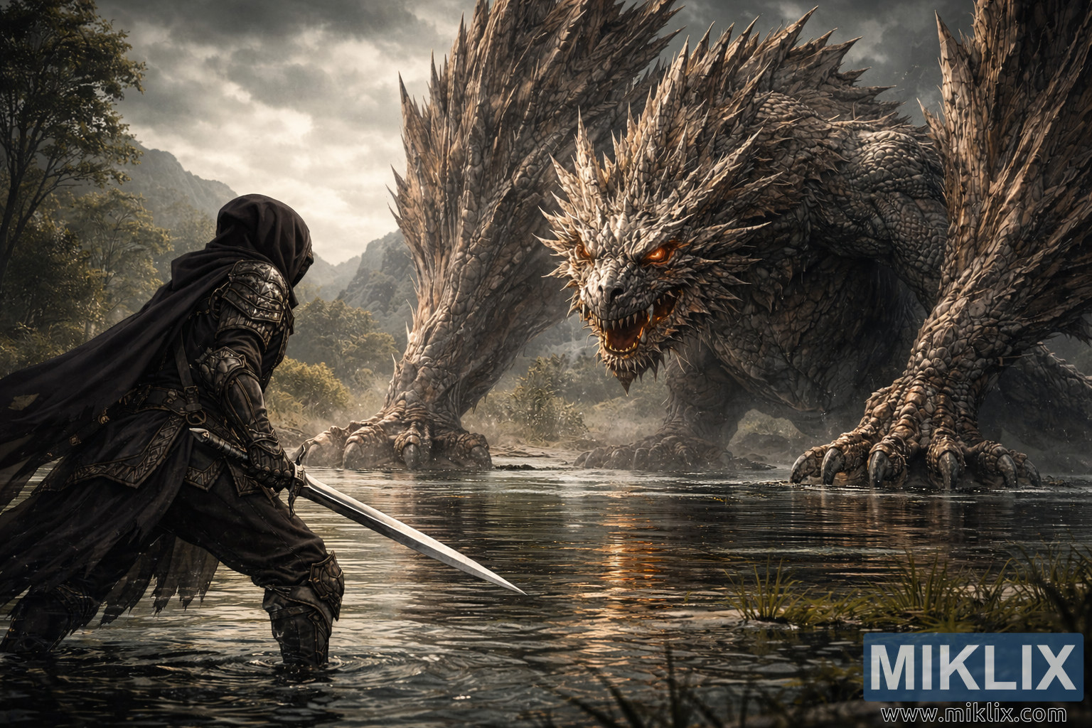 The environment contributes heavily to the scene’s immersive realism. The lake surface acts like a dark mirror, reflecting distorted silhouettes of both combatants, broken by reeds, small patches of marsh grass, and subtle wavelets caused by their presence. Surrounding the shoreline are rocky cliffs and uneven terrain softened by drifting mist and distant atmospheric haze. Sparse vegetation and low shrubs cling to the edges of the landscape, while the sky above is layered with dense storm clouds in tones of gray, green, and pale gold where thin shafts of light break through. The lighting is diffuse yet directional, creating strong contrasts along the edges of armor plates and dragon scales, enhancing depth and texture. The overall mood is one of suspended motion and palpable tension—a silent moment before chaos erupts—where the immense scale of the dragon contrasts with the solitary resolve of the warrior. Fine surface detailing, realistic lighting, and naturalistic color grading combine to create a powerful visual narrative that balances grounded realism with epic fantasy grandeur.