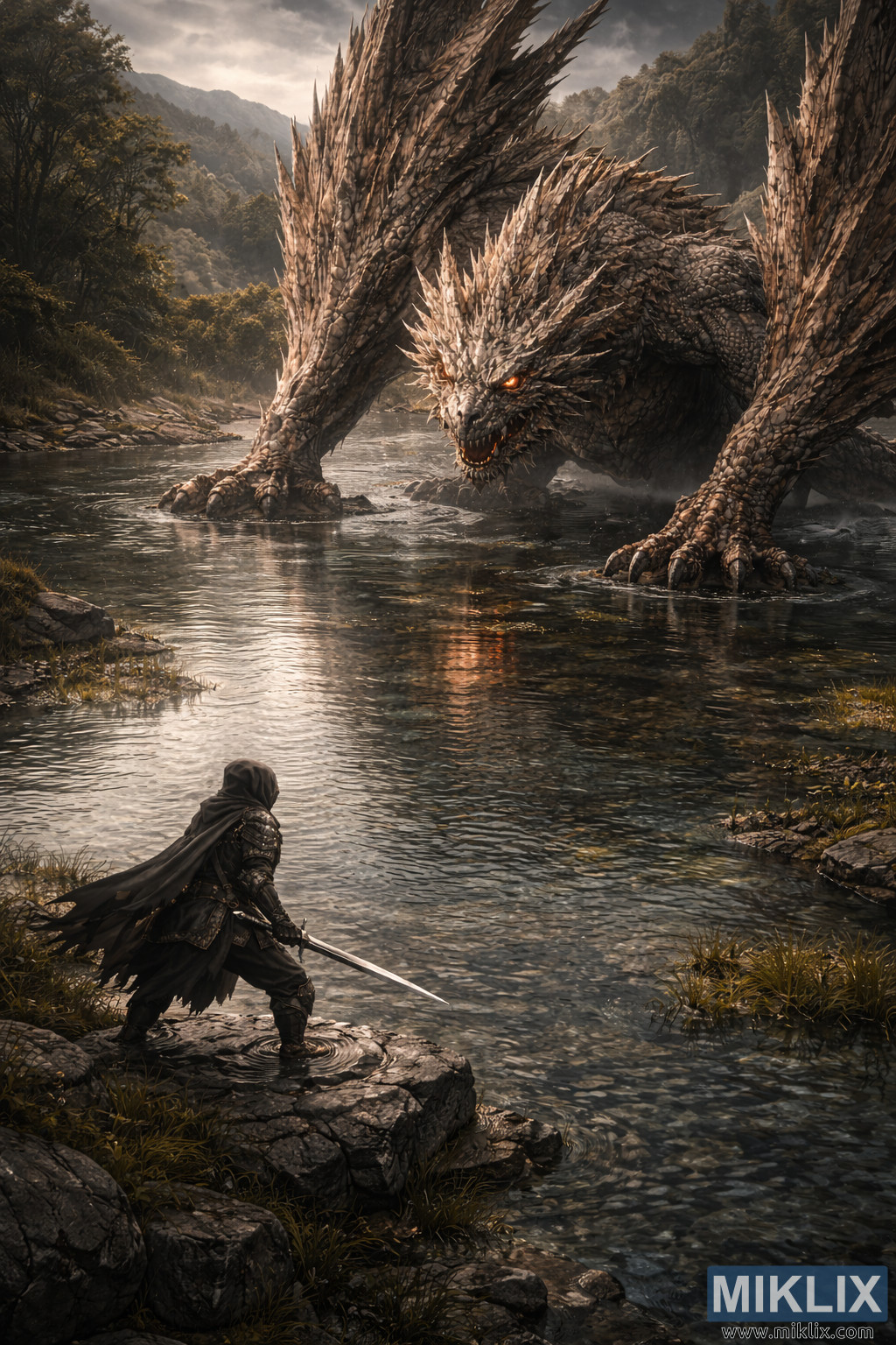 The environment is richly detailed and contributes heavily to the sense of realism and grandeur. The lake acts as a dark mirror, reflecting distorted silhouettes of both figures while reeds, tufts of grass, and scattered stones break the surface. Rocky shorelines curve around the water, leading toward forested hills and distant mountain ridges softened by atmospheric haze. Sparse vegetation clings to uneven terrain, and drifting mist hovers just above the lake, blurring edges and enhancing depth perception. Overhead, layered storm clouds in shades of gray, olive, and pale gold filter diffuse light across the landscape, creating soft highlights along armor edges and dragon scales while leaving valleys in shadow. The elevated perspective allows the viewer to appreciate the full breadth of the setting, turning the confrontation into a tableau of scale and silence. The overall mood is one of suspended motion—the final breath before chaos—where the solitary resolve of the warrior contrasts sharply with the overwhelming magnitude of the dragon. Fine surface detailing, naturalistic lighting, and cinematic composition combine to produce an epic yet grounded fantasy scene that balances realism, tension, and environmental immersion.