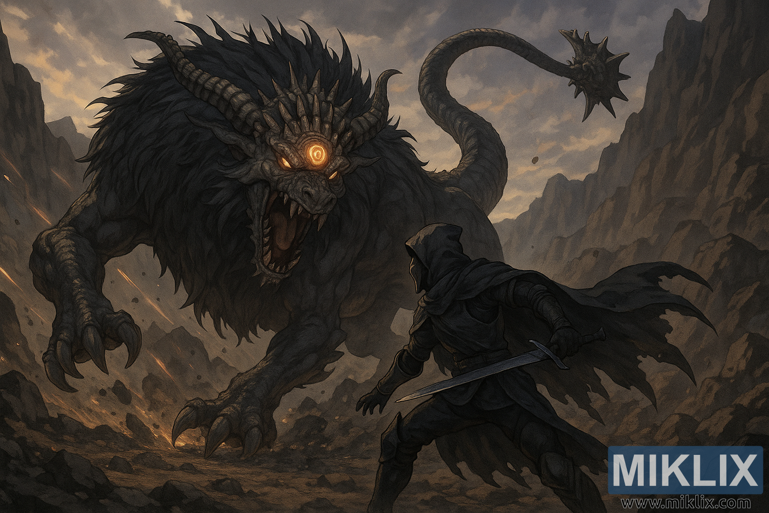 Coiling behind the beast is its thick, segmented tail, ending in a deadly star-shaped mass of fused stone and metal. The tail arches high, poised to strike down with crushing force. Dust and small debris are suspended in the air from the beast’s sudden advance, while molten glimmers beneath the cracked earth hint at Gelmir’s volcanic unrest. The jagged cliffs of the mountain range rise steeply on both sides, enclosing the battlefield in stark, oppressive stone.