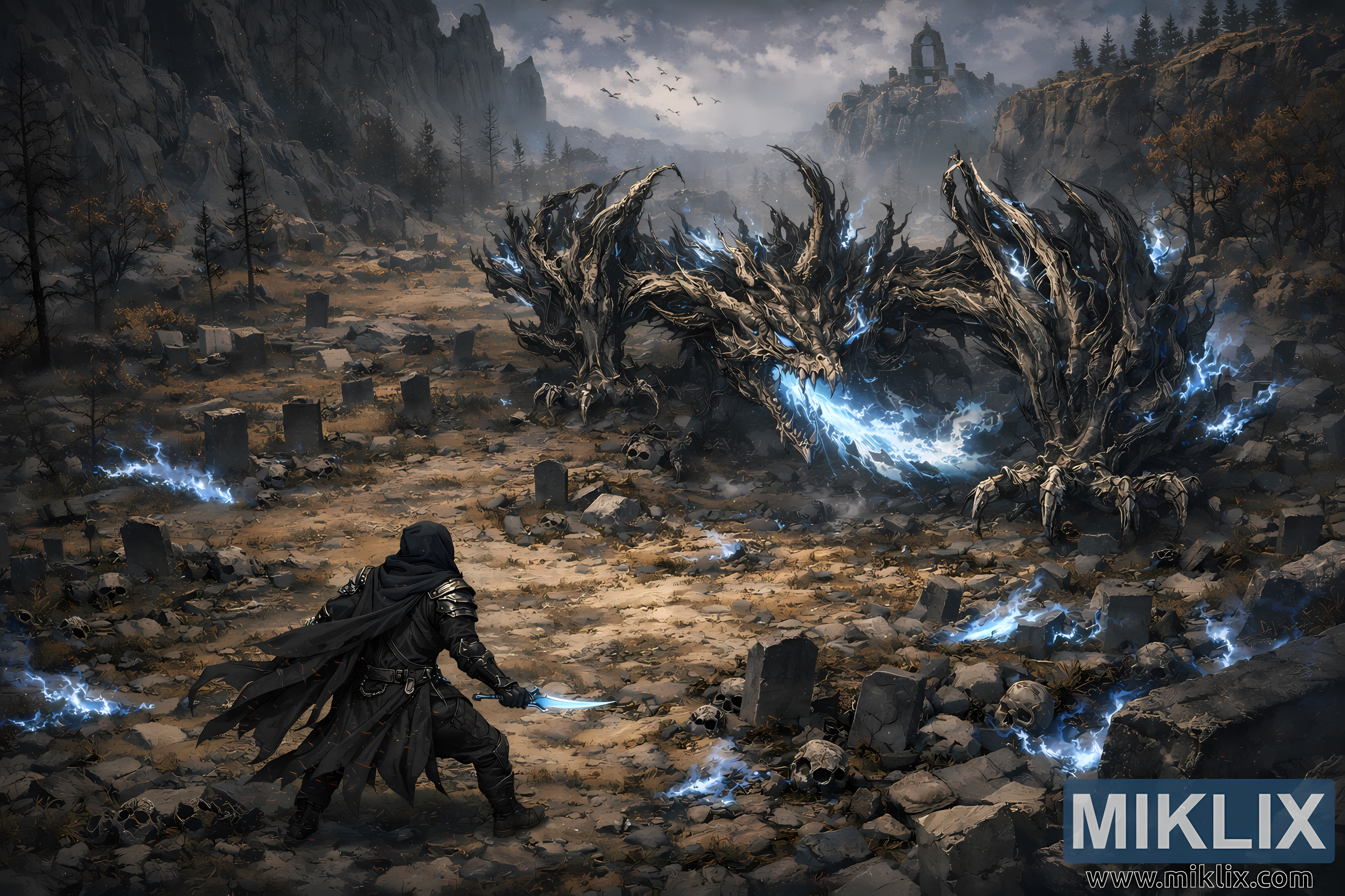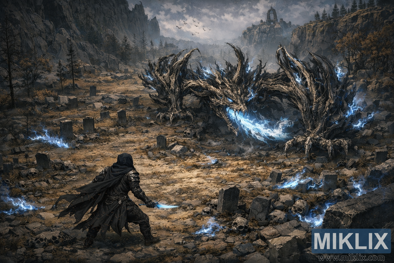 The terrain is bleak and unforgiving. Hundreds of cracked tombstones jut from the earth at uneven angles, many toppled or broken, with skulls and bone fragments scattered between them. The soil is dry and compacted, broken only by shards of stone and faint traces of glowing blue residue left behind by the dragon’s breath. Sparse, leafless trees line the valley, their dark trunks echoing the dragon’s twisted limbs. Steep cliffs hem in the scene on both sides, rising sharply and funneling the eye toward the confrontation. Far above, a ruined structure perches on a distant ridge, its silhouette barely visible through a veil of mist and ash.