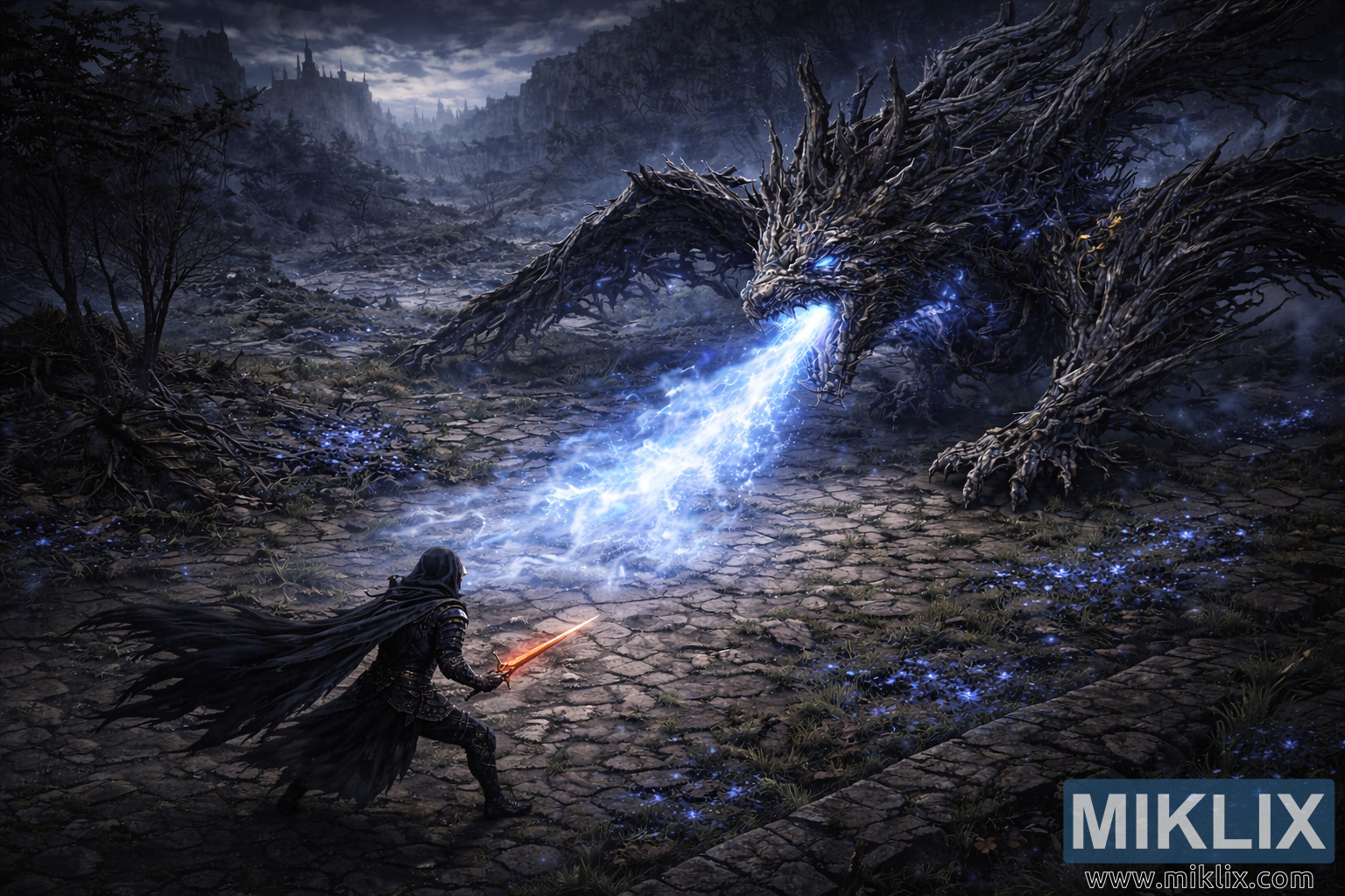 On the right side of the frame dominates the Ghostflame Dragon, a monstrous colossus that dwarfs the Tarnished completely. Its body looks less like flesh and more like a mass of burned timber and fossilized bone, twisted together into a nightmarish form. Jagged wings stretch outward like the broken limbs of a dead forest, and its skull-like head is crowned with splintered horns and ridges. The dragon’s eyes burn with a hard cerulean glow, and from its open jaws erupts a roaring torrent of ghostflame. The blue fire is bright yet strangely cold, filling the air with shimmering sparks and lighting the ruined highway in an eerie, spectral wash.