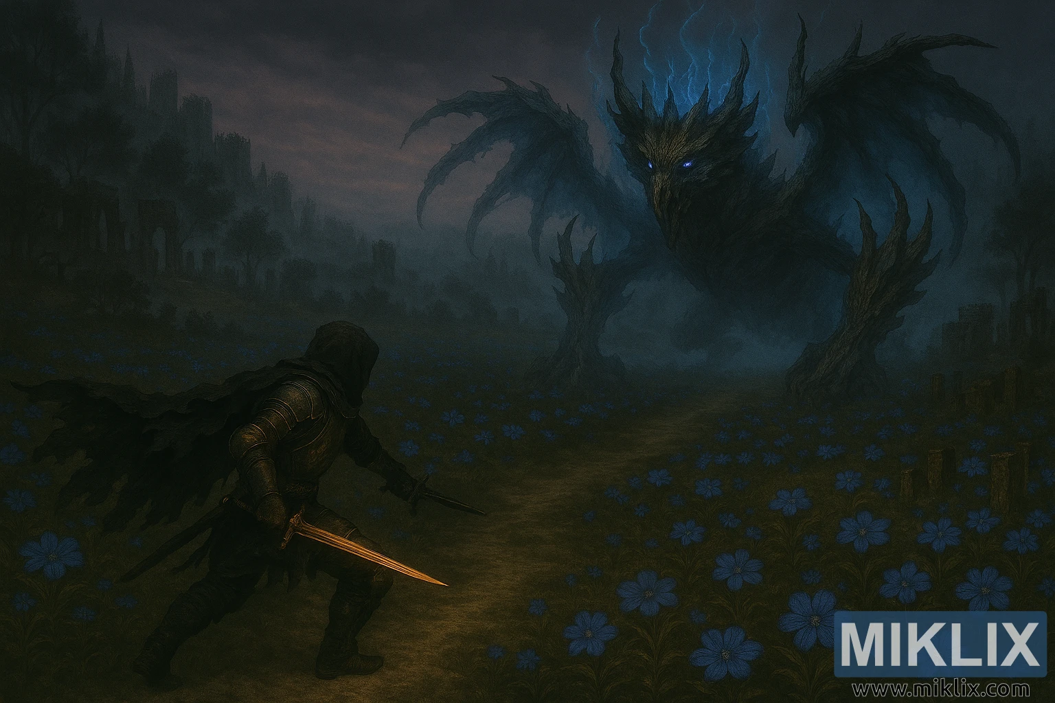 The image is related to: Elden Ring: Ghostflame Dragon (Moorth Highway) Boss Fight (SOTE)