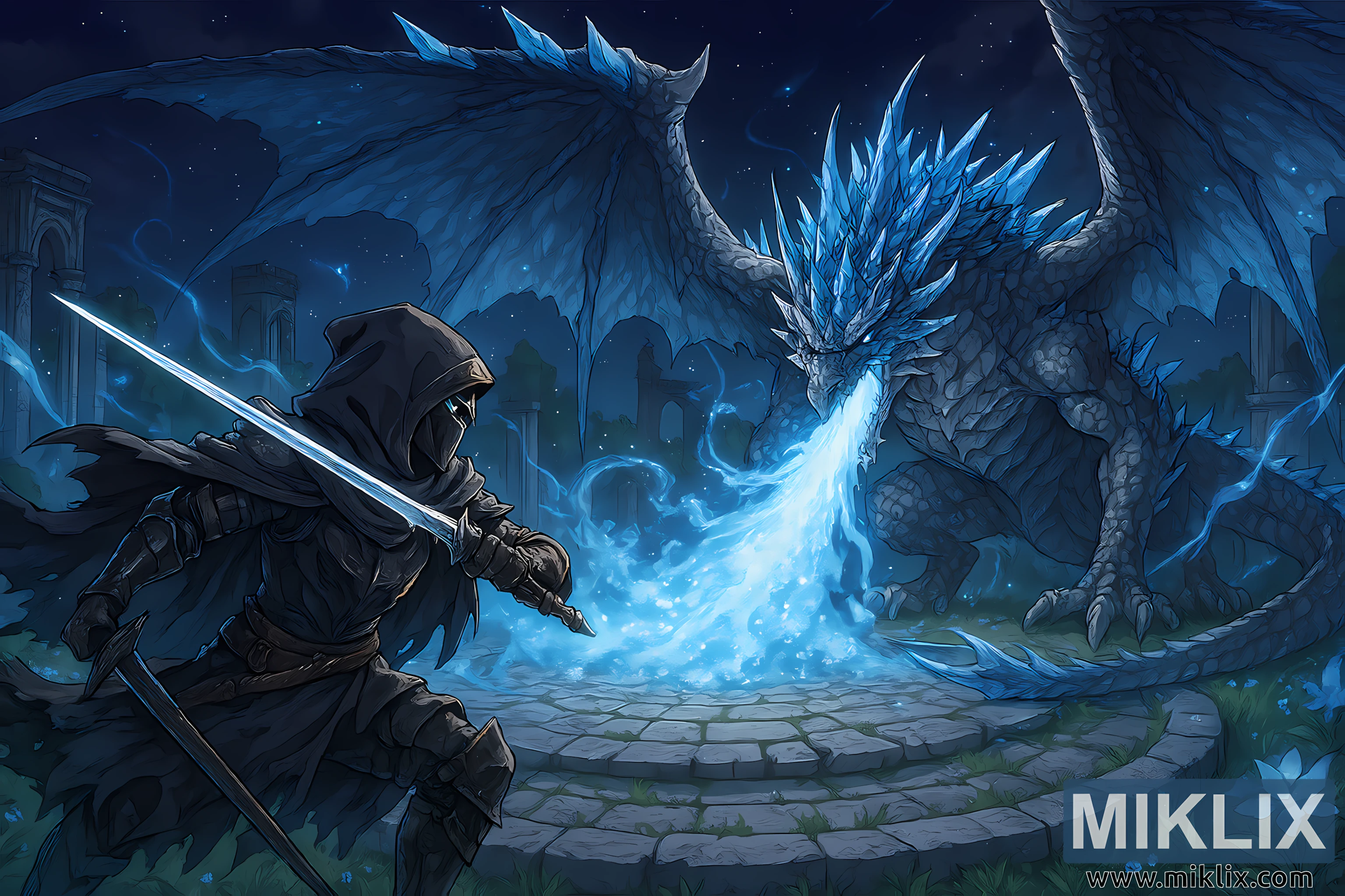 Every texture—from the dragon’s crystalline wings to the Tarnished’s armor and the weathered stone—is meticulously rendered. The brushwork evokes motion and intensity, while the color palette of cool blues and purples reinforces the magical, high-stakes atmosphere. This image is a tribute to Elden Ring’s epic storytelling and visual grandeur, blending anime aesthetics with fantasy realism in a moment of heroic defiance and mythical power.