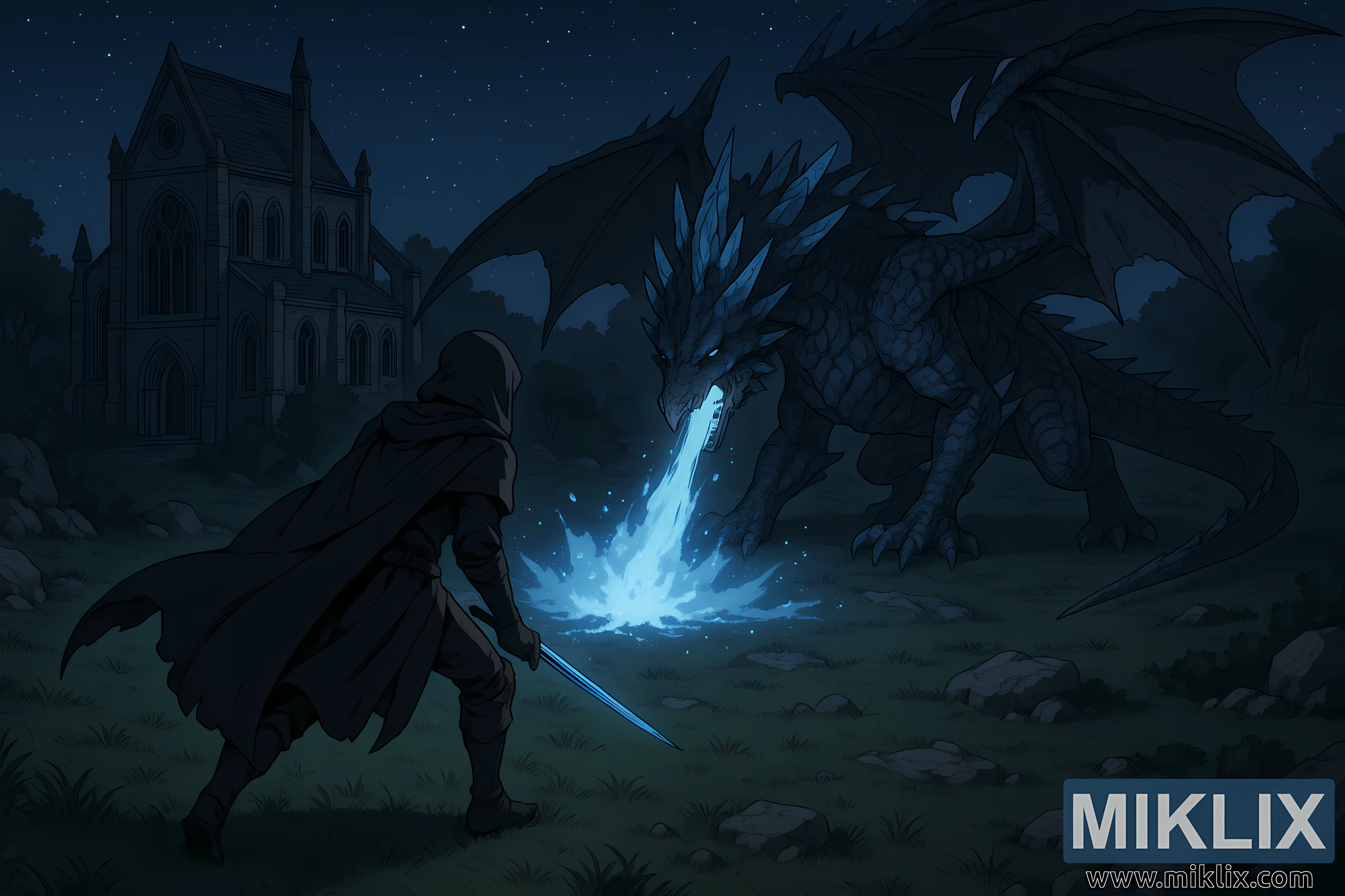 In the upper-left background rises the ruined Cathedral of Manus Celes. Seen from the elevated perspective, its gothic architecture—arched windows, steep rooflines, and weathered stone walls—is clearly defined against the night sky. The cathedral appears abandoned and solemn, partially swallowed by darkness and surrounded by trees and uneven terrain. Its presence adds a sense of history, melancholy, and scale, reinforcing the mythic weight of the confrontation unfolding before it.