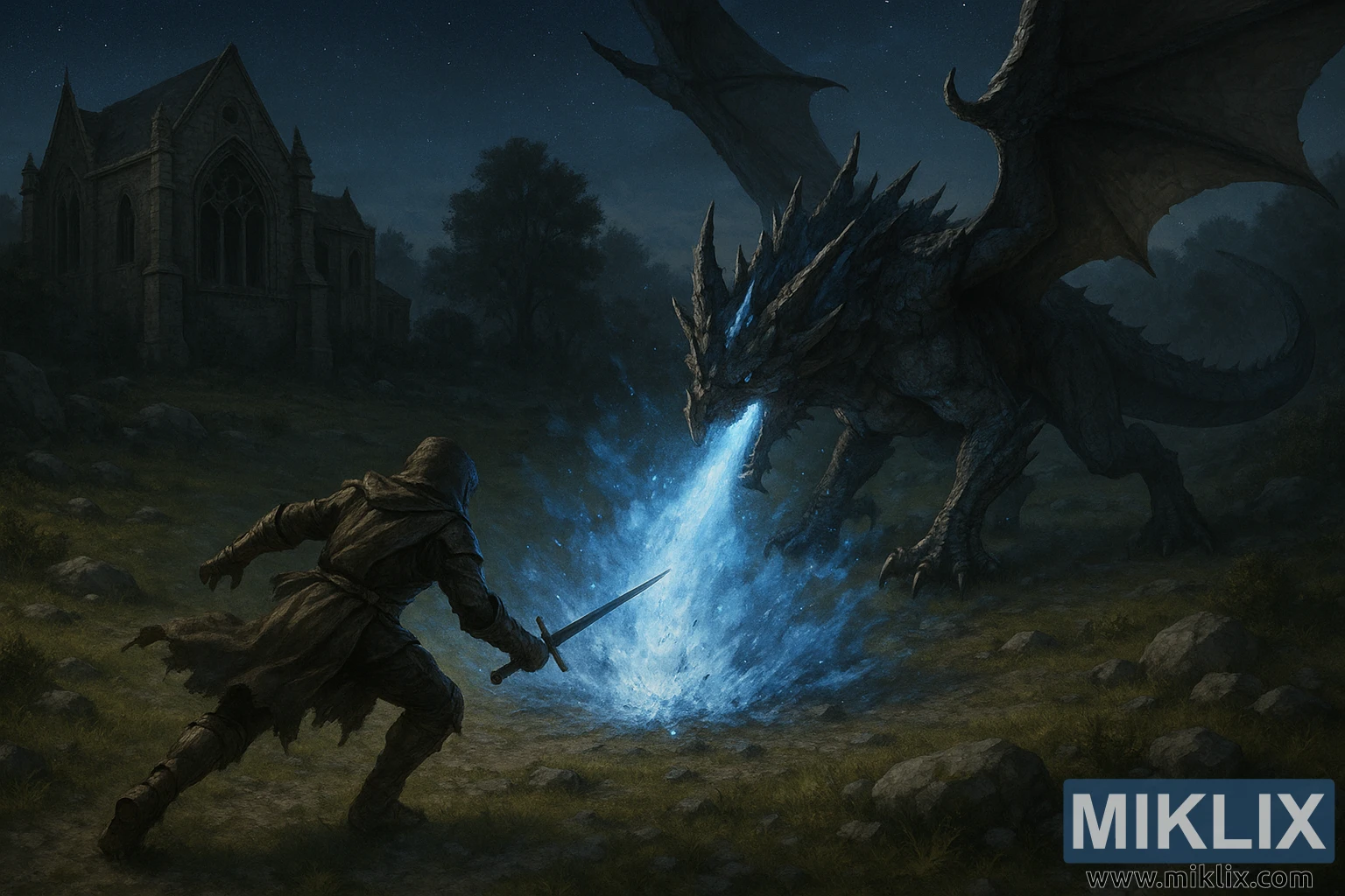High-resolution Elden Ring fan art showing an actively lit battle between the Tarnished and Glintstone Dragon Adula outside the Cathedral of Manus Celes under a starry sky.