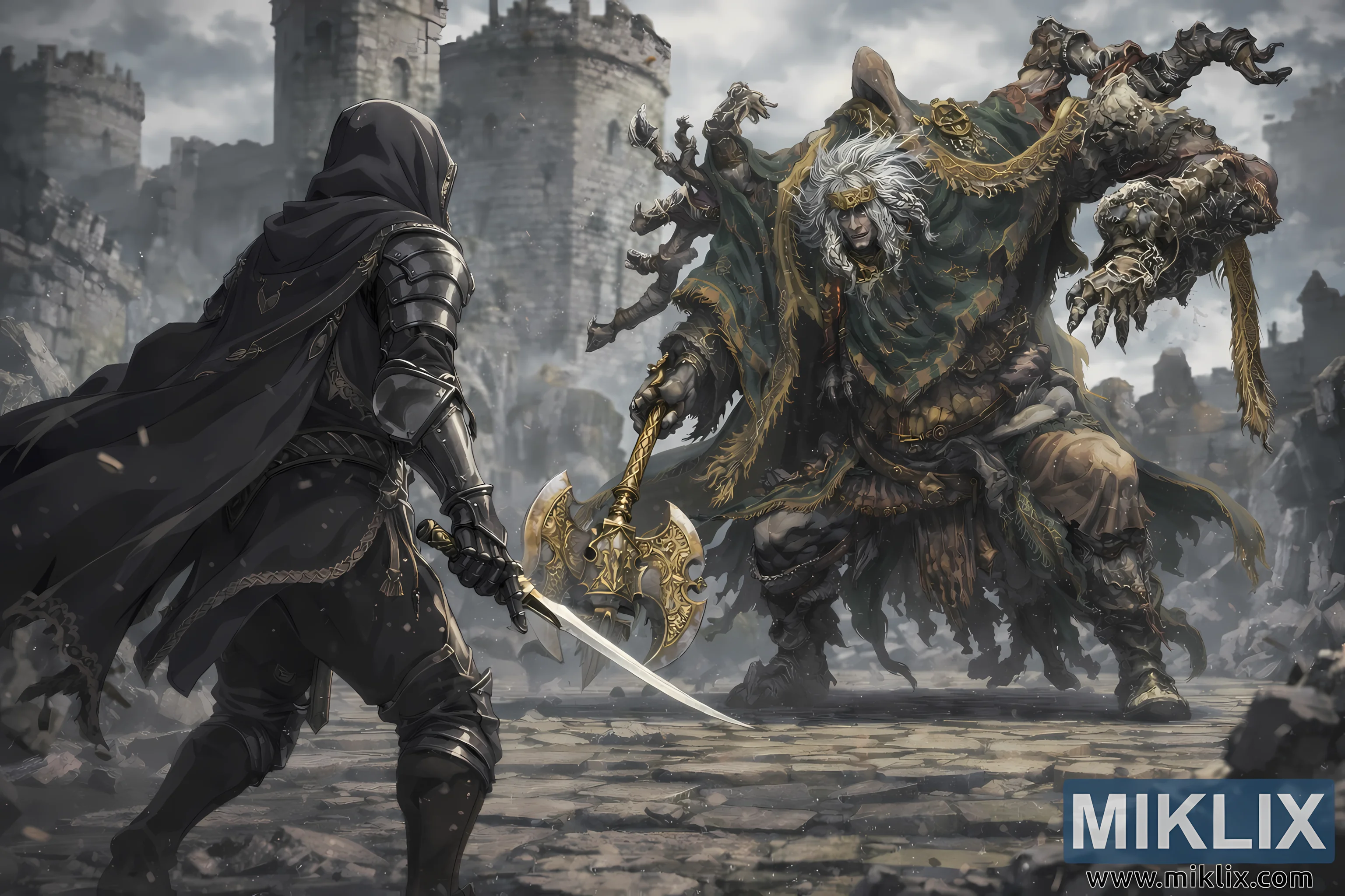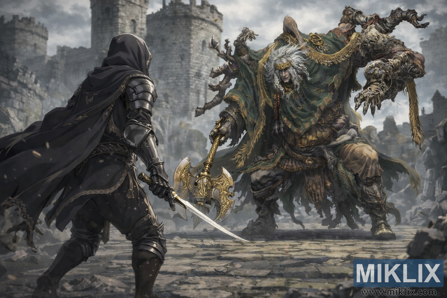The environment reinforces the uneasy calm. Stormveil’s stone towers rise in the background, softened by mist and distance, their battlements jagged where age and war have chewed away at the masonry. The sky is overcast and cold, a pale gray canopy that presses down on the ruined courtyard. Dust, ash, or light snow drifts through the air in small flecks, giving the image motion even though both combatants are still. Broken rubble and uneven slabs frame the edges of the foreground, suggesting a battlefield already scarred long before this confrontation.