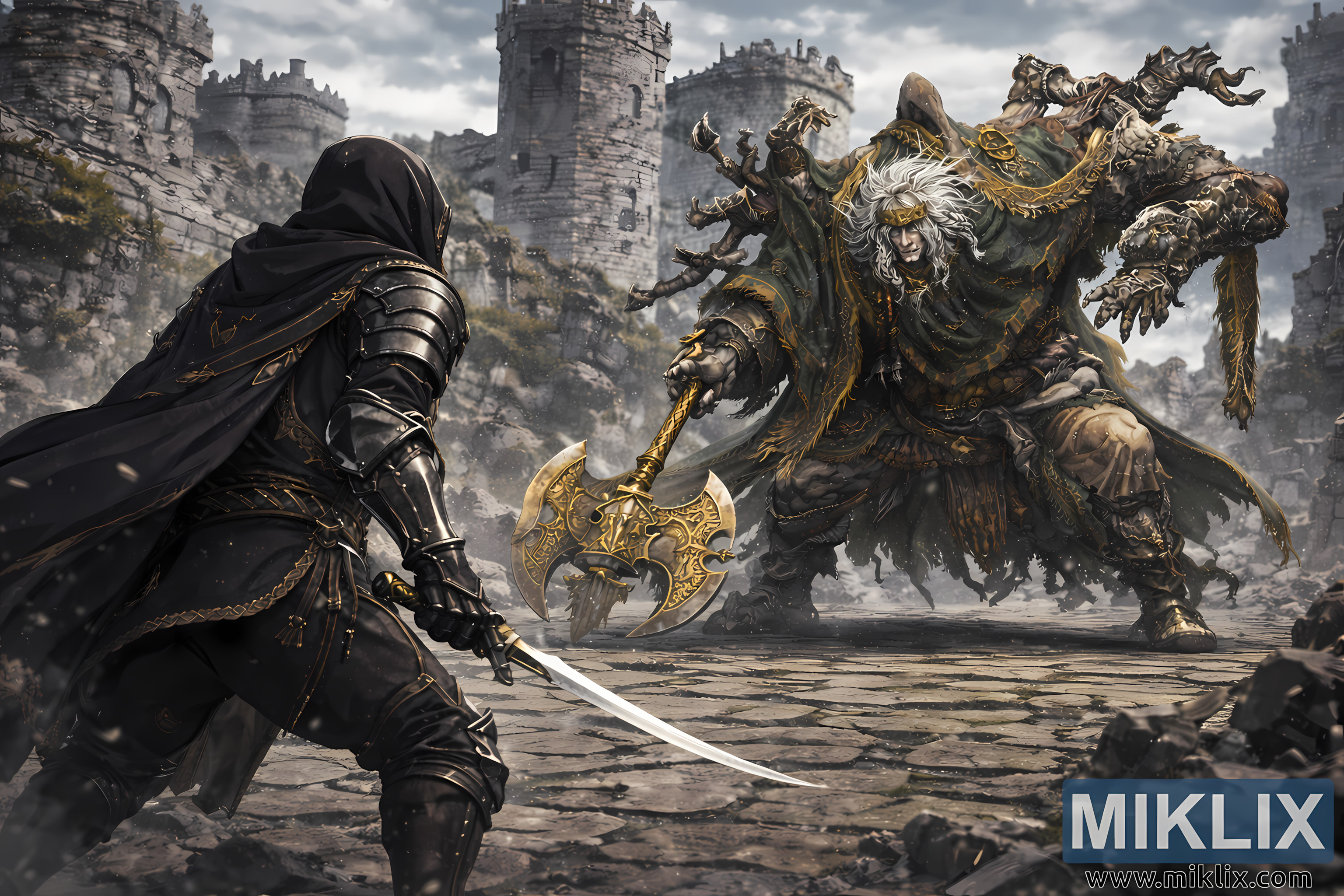 A dramatic, anime-leaning digital painting captures the instant before violence erupts in Stormveil Castle’s ruined courtyard, now with the two opponents drawn much closer together. The camera remains low and slightly behind the Tarnished on the left, creating an over-the-shoulder perspective that emphasizes the warrior’s readiness and funnels attention directly to the towering boss. The Tarnished fills the left foreground with a dark, angular silhouette: Black Knife–inspired armor plates wrap the shoulders and arms, while a heavy hood and cloak flow backward in layered folds. Fine gold filigree and stitching trace along the cloak’s edges and seams, adding elegant highlights to the otherwise matte black fabric. Straps, belts, and small ornamental ties gather at the waist, reinforcing a refined, assassin-like look. The Tarnished’s stance is cautious and braced—knees bent, torso angled forward—suggesting a measured approach rather than a reckless lunge.