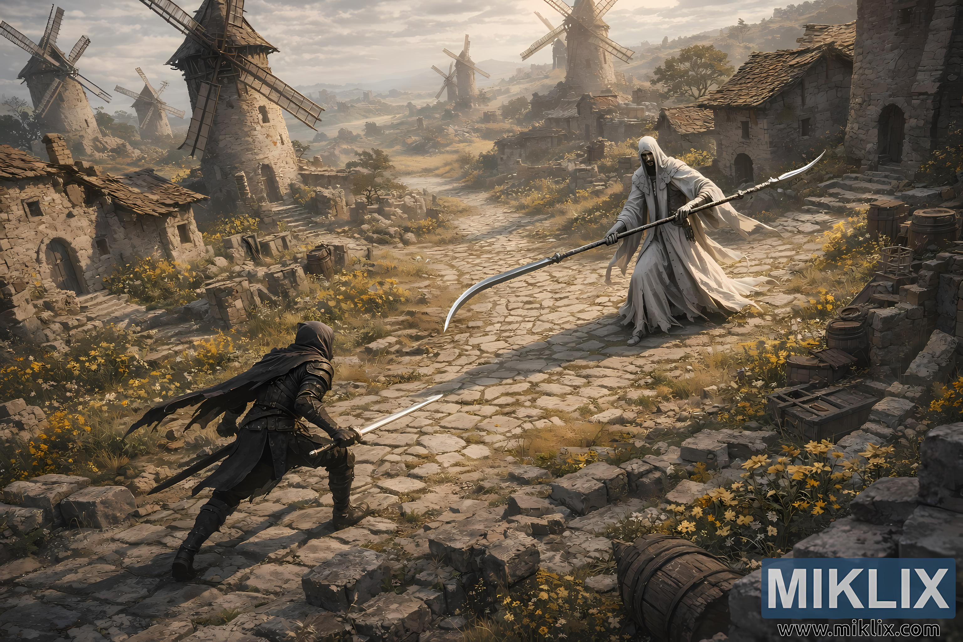 The elevated perspective allows the viewer to see the duel as part of a larger, haunting tableau. The quiet beauty of Dominula Windmill Village—its flowers, stone paths, and windmills—stands in stark contrast to the grim, otherworldly figures at its center. The image captures a single suspended moment before motion erupts, blending atmosphere, scale, and lore accuracy into a dramatic snapshot of the Lands Between.