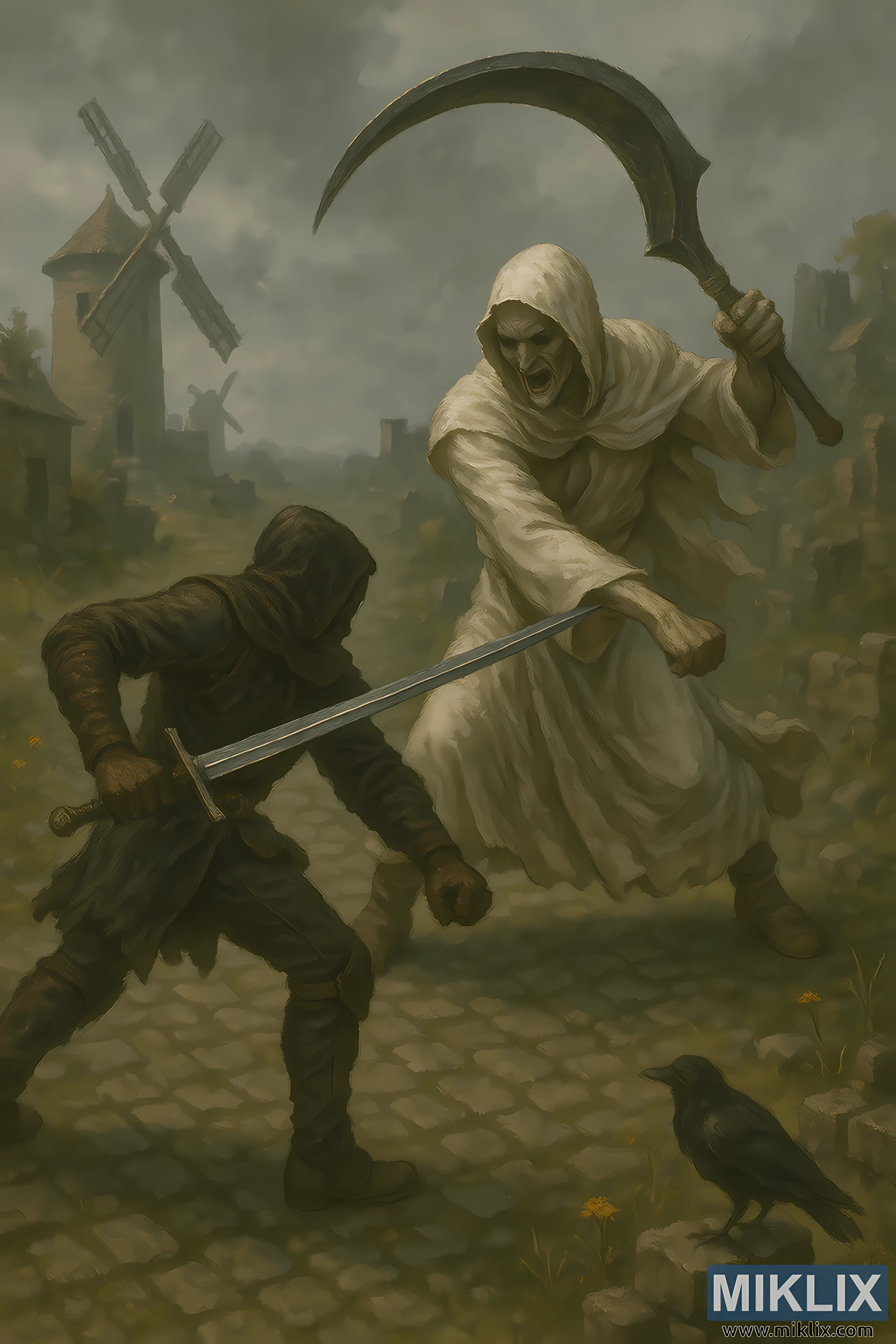 Small environmental details heighten the atmosphere: a black crow perches on a broken stone in the foreground, watching the duel, while distant windmills and ruins frame the combatants like silent witnesses. The overall composition conveys true combat rather than a posed standoff—both figures are in motion, unbalanced in realistic ways, and fully committed to their strikes. The image captures the brutality and tension of battle in the Lands Between, blending grim realism with the haunting beauty of Dominula Windmill Village.