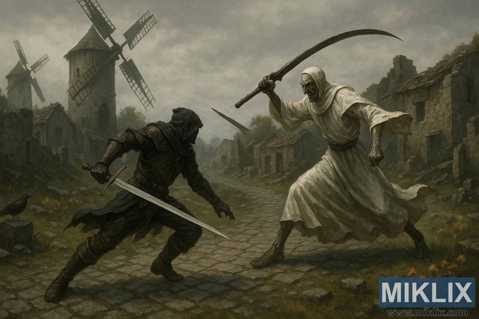 The image shows a dramatic, landscape-oriented battle scene set in Dominula, Windmill Village from Elden Ring, rendered in a gritty, painterly dark-fantasy style. The camera is pulled back into a wide, cinematic frame, allowing the duel to unfold across the center of a ruined cobblestone road that stretches into the distance. On both sides of the road, collapsed stone houses and broken walls form a corridor of decay, their roofs sagging and their textures softened by age. Tall windmills rise behind the village, their wooden blades angled against a heavy, cloud-filled sky that casts diffuse gray light over the scene. Patches of yellow wildflowers and creeping grass push through the stones, adding unsettling beauty to the otherwise desolate environment.