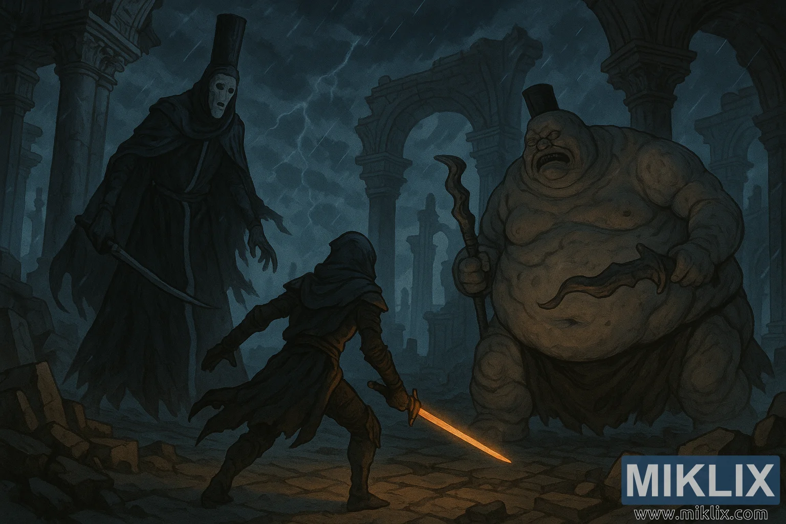 Before him, the grotesque forms of the Godskin Duo emerge from the temple’s shadows, their presence both regal and revolting. To the left stands the Godskin Noble—tall and lithe, draped in dark, flowing robes that move like liquid shadow. His featureless white mask hides all emotion, his curved blade glinting faintly beneath the stormlight. His very posture suggests a cruel grace, a predator’s poise born from centuries of blasphemous worship.