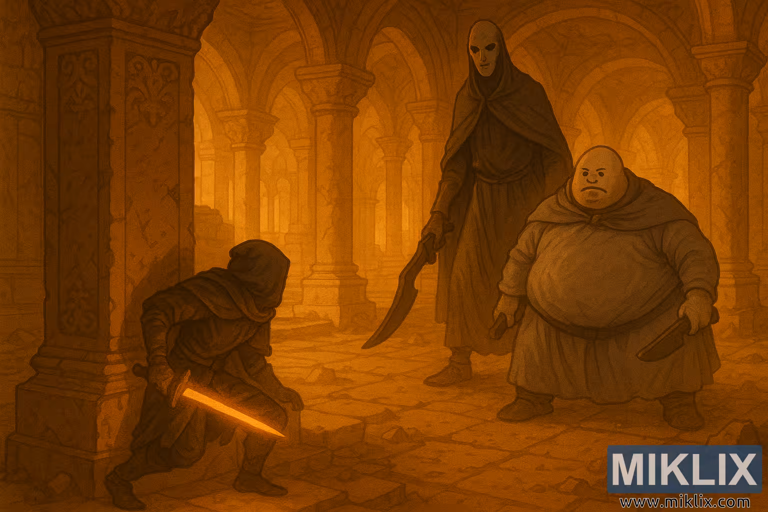 The artist masterfully balances light and composition: the radiant warmth of the temple contrasts the cold menace of the Godskins, while the Black Knife assassin remains framed in both shadow and glow—caught between stealth and confrontation. Every texture, from the cracked stone beneath the assassin’s boots to the soft folds of the Godskins’ robes, adds to the scene’s realism and depth.