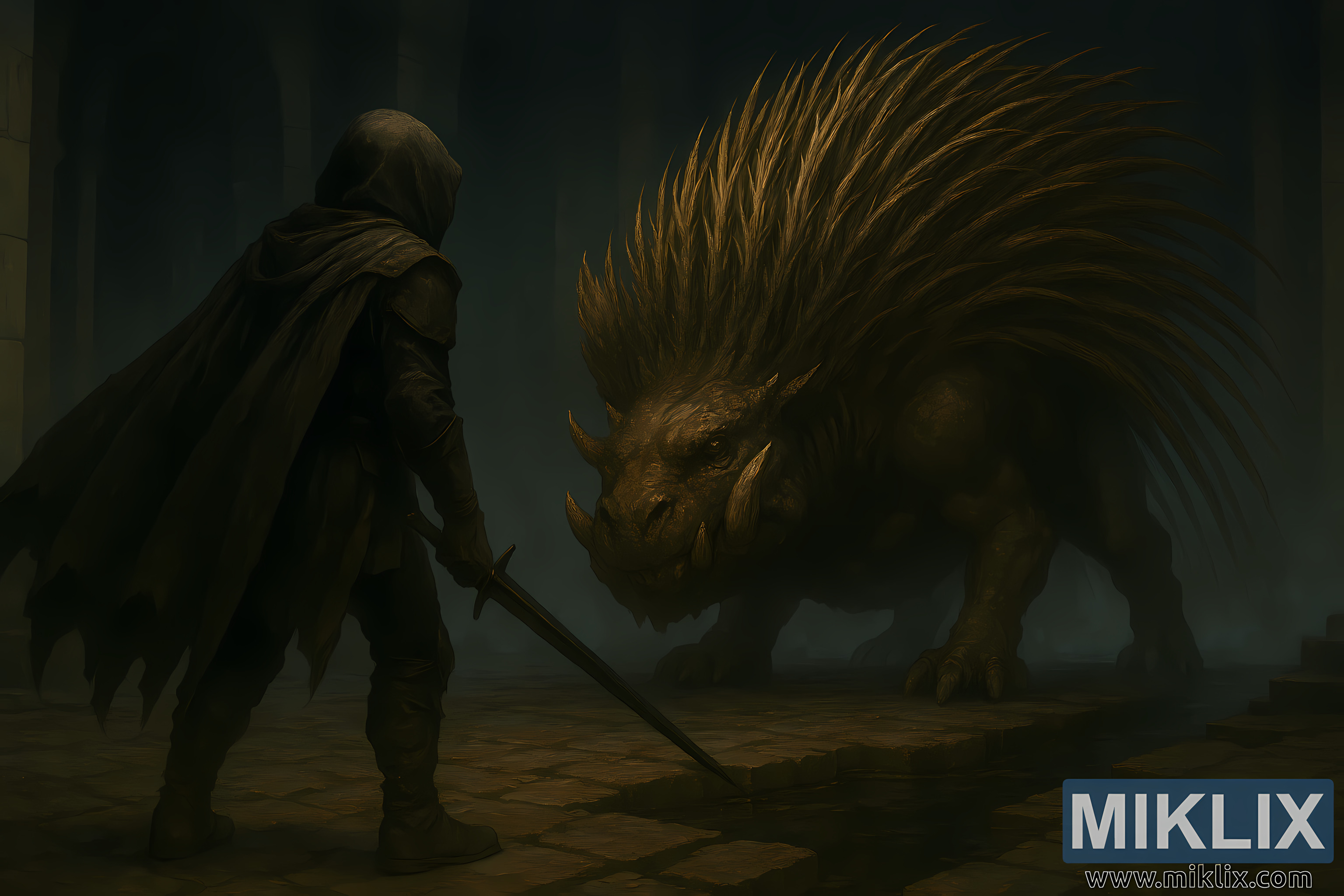 Opposite, the Golden Hippopotamus boss dominates the right side of the frame. Its massive, quadrupedal form is hunched and muscular, covered in leathery, dark hide with patches of tarnished gold. Its back is crowned with an array of enormous, golden-brown quills that radiate outward like a fan of spears, each rendered with intricate texture and depth. The creature’s head is low, eyes glowing with a baleful amber light, and its mouth slightly agape, revealing jagged tusks and sharp teeth. Its thick legs end in clawed feet that grip the uneven stone floor, poised to lunge.