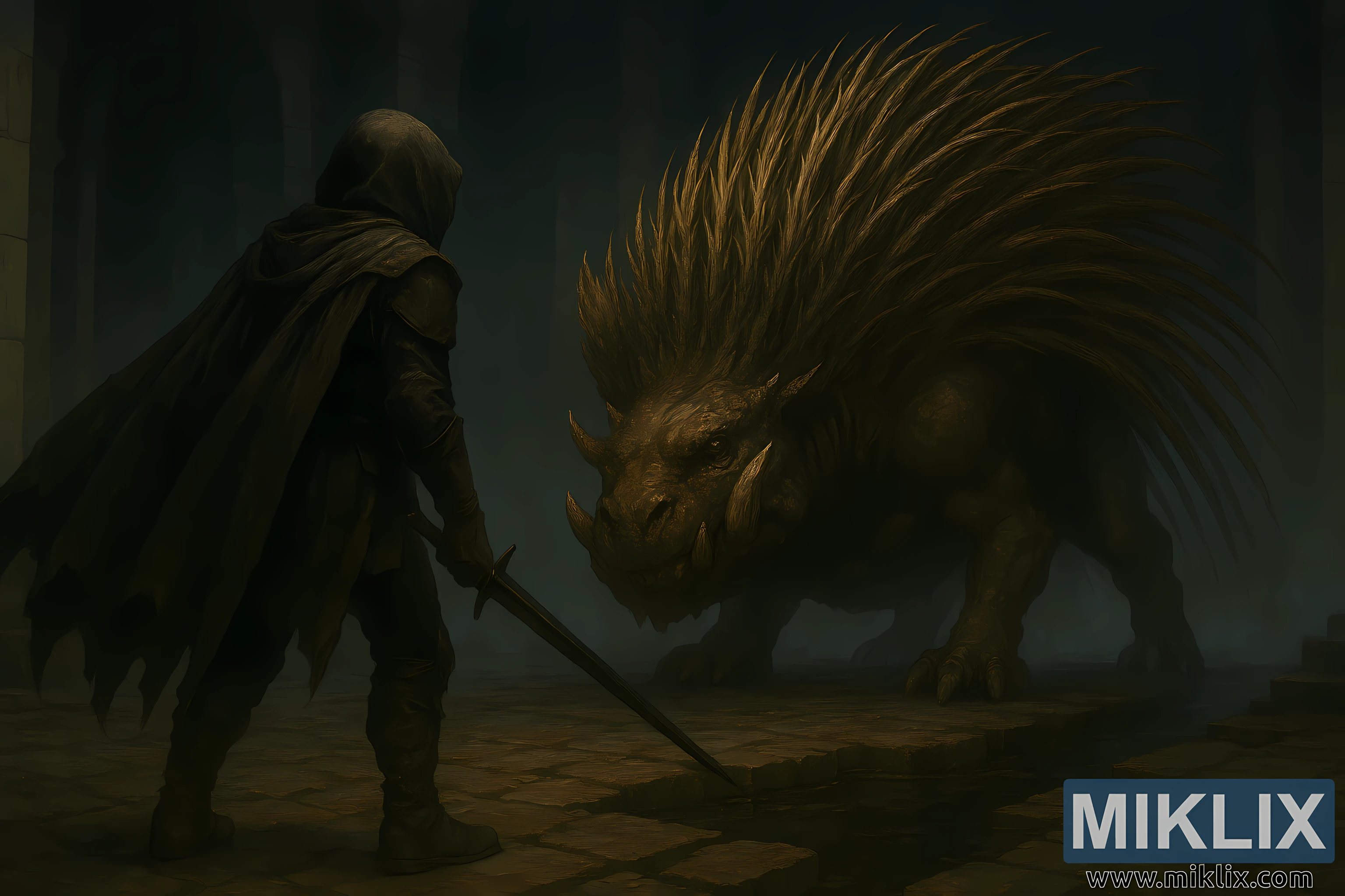 The composition is balanced and cinematic, with the Tarnished and the boss positioned at opposite ends of the frame. Diagonal lines formed by the warrior’s sword and the creature’s spines guide the viewer’s eye toward the center, where tension peaks. The muted, earthy color palette enhances the somber mood, while the golden hues of the creature’s quills and eyes provide striking contrast.