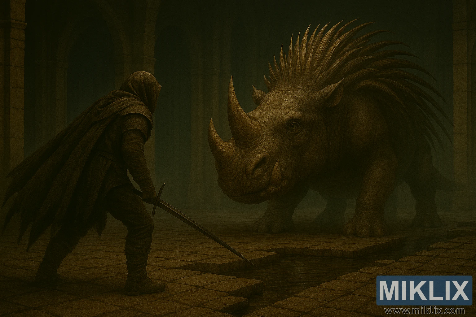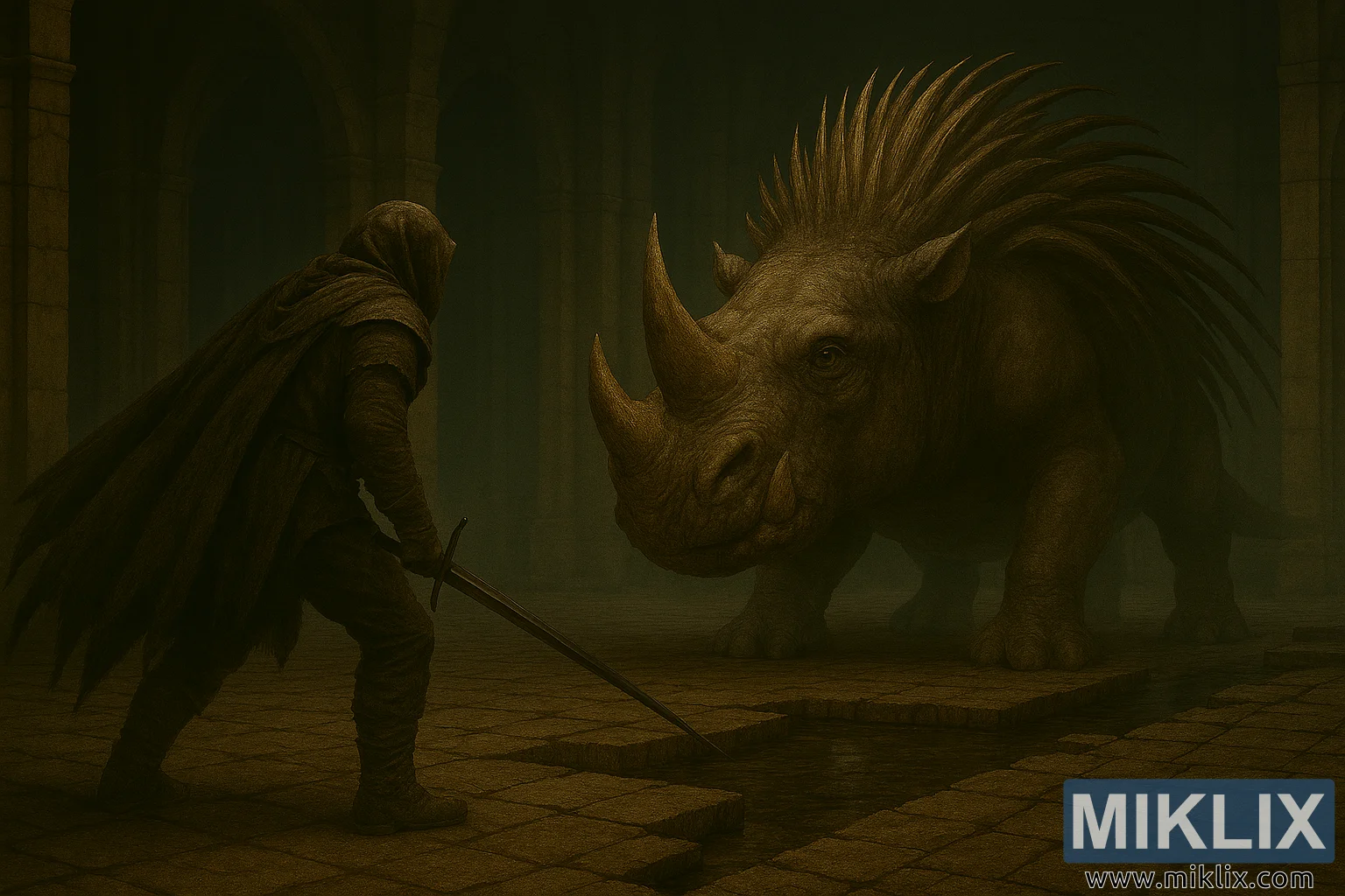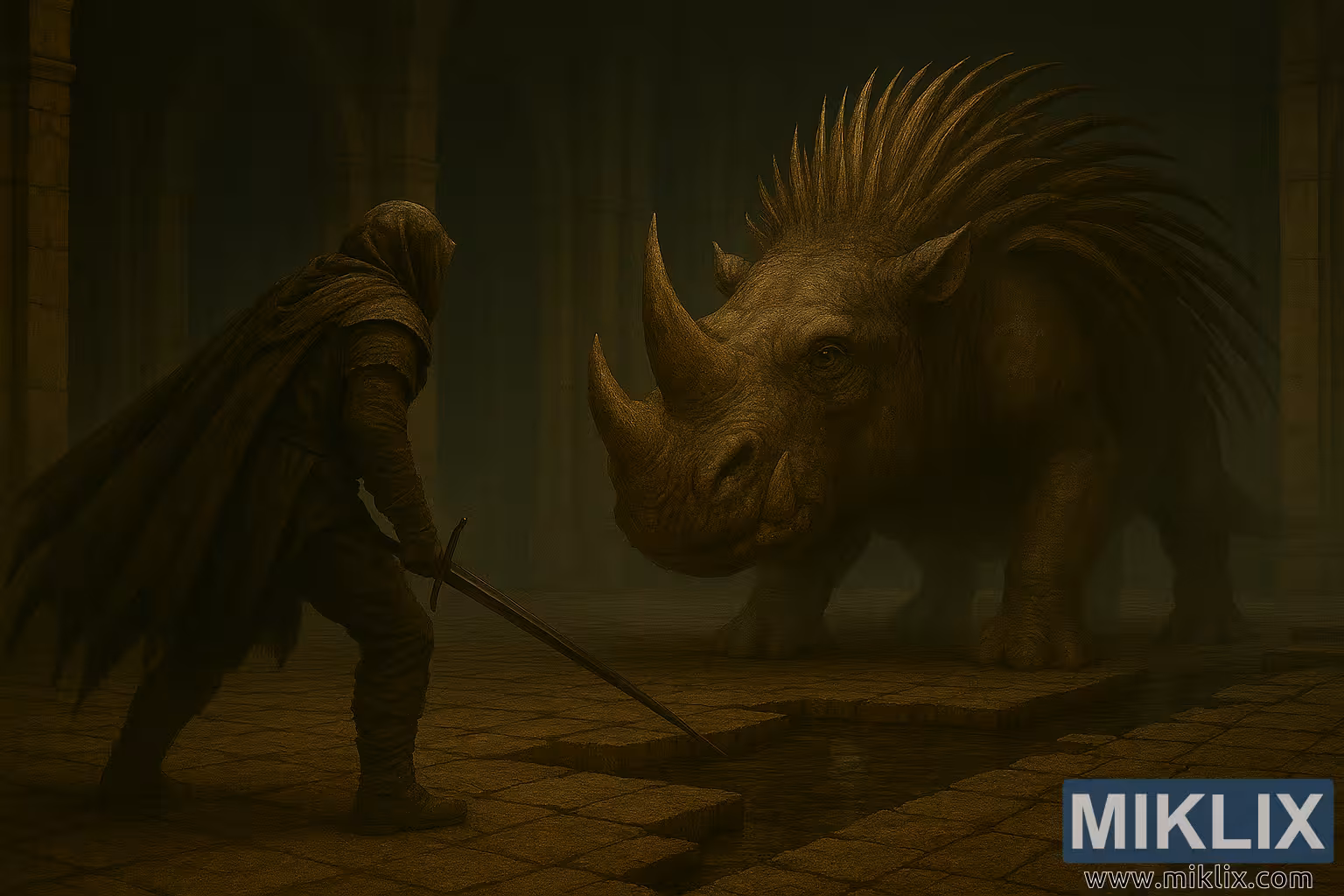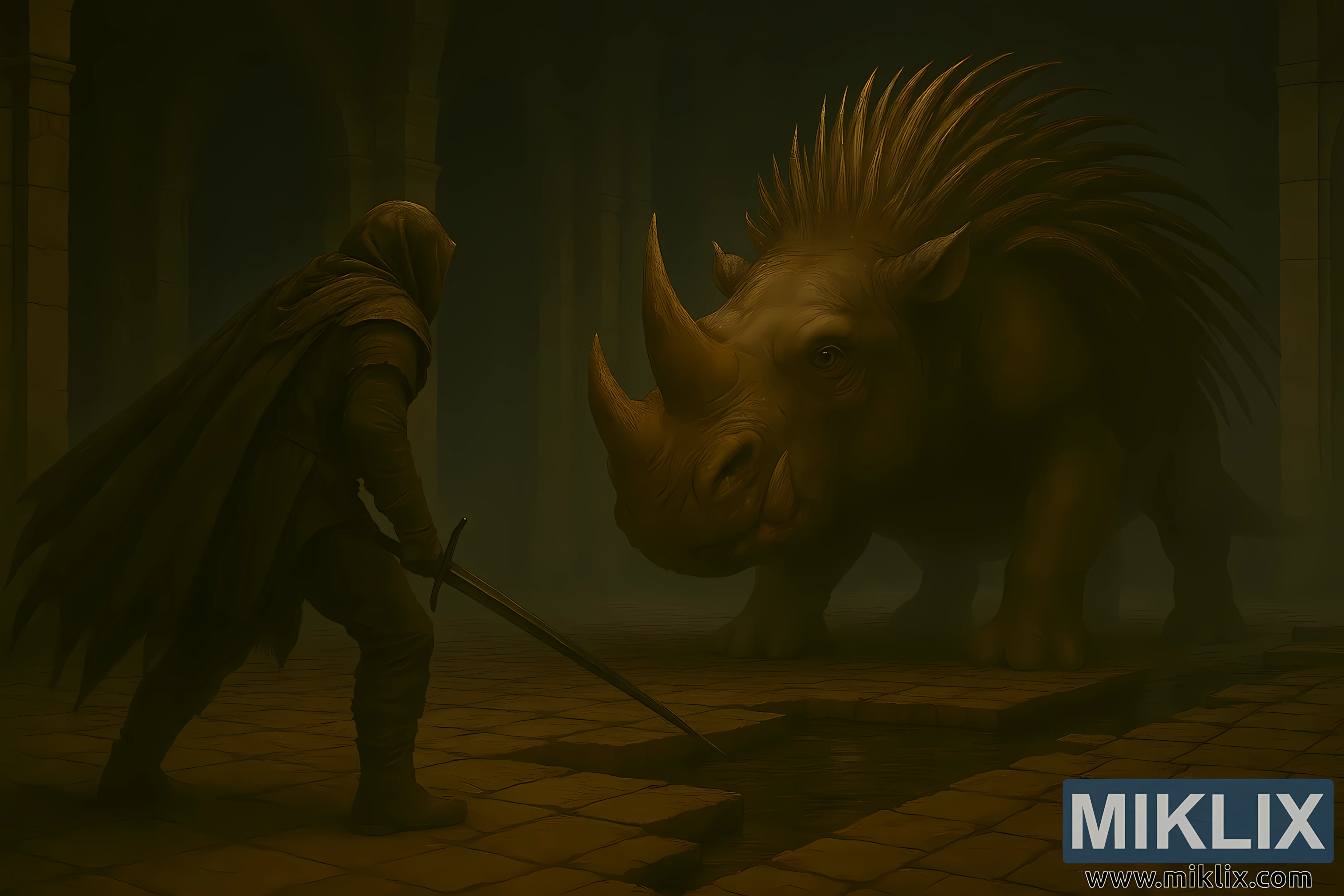 Opposite, the Golden Hippopotamus boss dominates the right side of the frame. Its massive, quadrupedal body resembles a monstrous hippopotamus fused with rhinoceros traits. The creature’s hide is thick, leathery, and deeply wrinkled, textured with scars and patches of dried mud. A large, sharply pointed horn protrudes from its snout, flanked by smaller tusks and a gaping mouth. Its glowing yellow eyes are deep-set beneath a heavy brow, radiating primal hostility.