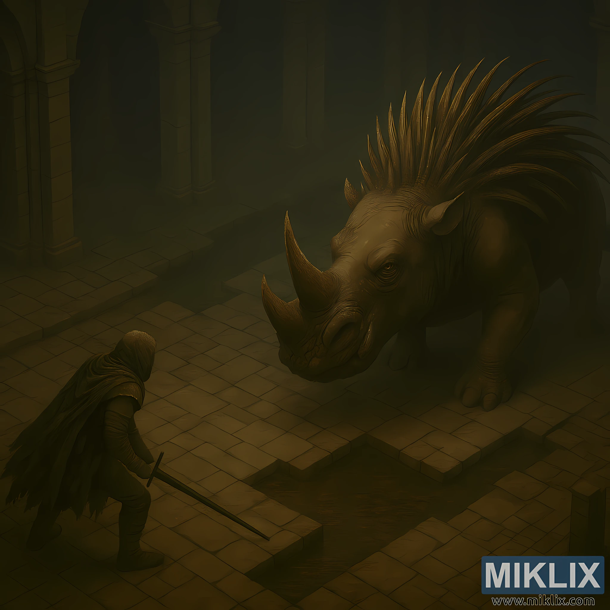 Opposite, the Golden Hippopotamus boss looms with terrifying scale. Its massive, quadrupedal body resembles a monstrous hippopotamus fused with rhinoceros traits. The creature’s hide is thick, leathery, and deeply wrinkled, textured with scars and patches of dried mud. A large, sharply pointed horn protrudes from its snout, flanked by smaller tusks and a gaping mouth. Its glowing yellow eyes are deep-set beneath a heavy brow, radiating primal hostility.