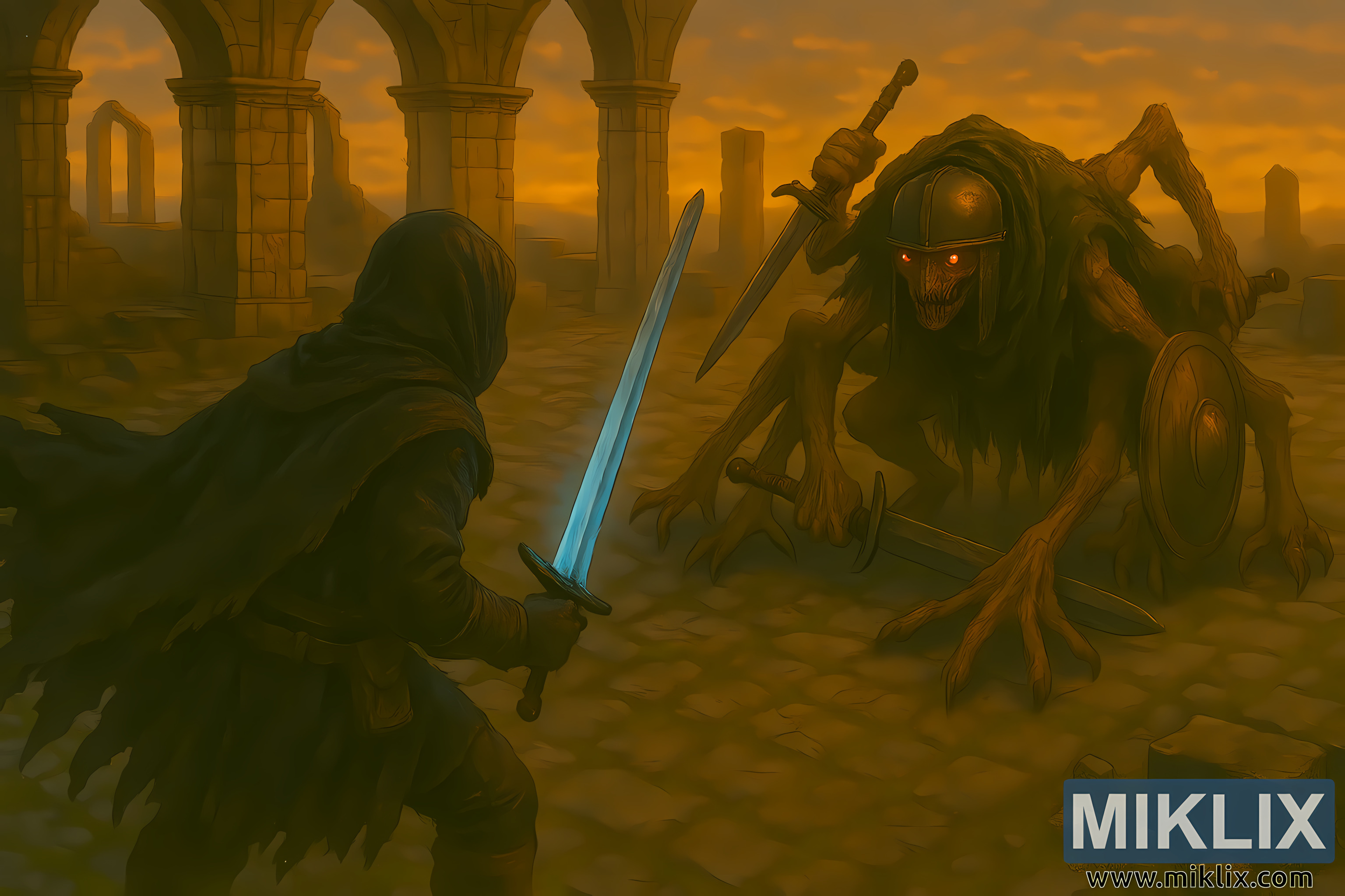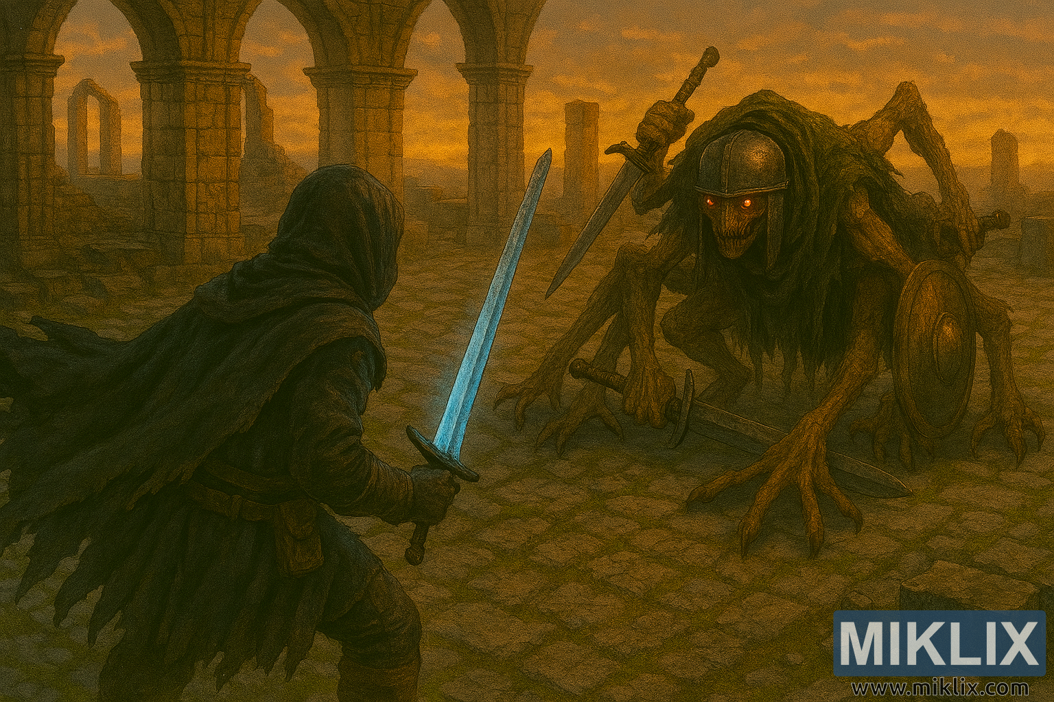 Opposite him crawls the Grafted Scion, now rendered with heightened grotesque realism. Its golden skull-like head is encased in a dented, rusted cap-style helmet, with glowing orange eyes peering from beneath the metal. The creature’s emaciated frame is draped in decayed, dark green cloth that hangs in ragged folds. It crawls on four twisted limbs, each clawed and sinewy, bracing against the uneven cobblestones. Several additional arms extend from its torso, wielding weapons: a rusted, slightly curved sword in its right hand, and a large, round wooden shield with a weathered metal boss in its left. Other limbs reach outward, adding to its spider-like posture and chaotic anatomy.