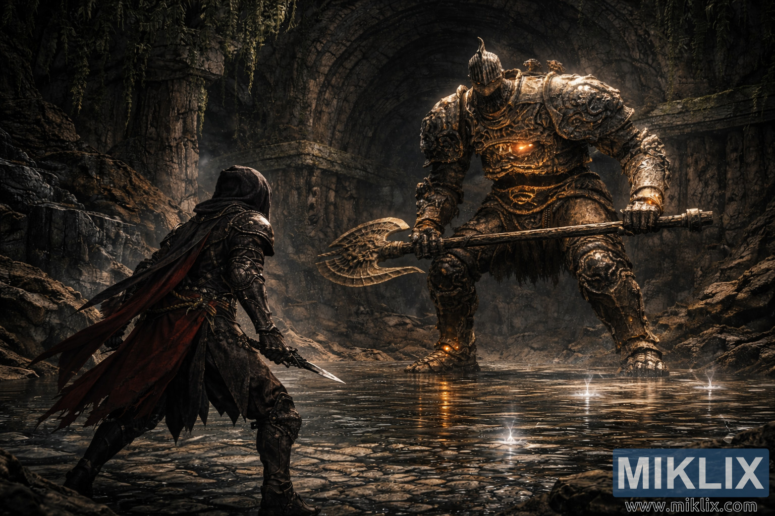 The expanded view reveals more of the cavern’s grandeur. Towering stone arches curve overhead into darkness, their surfaces draped with hanging vines, moss, and mineral deposits formed by years of moisture. Jagged rock formations and crumbling masonry line the walls, while shallow water blankets the cave floor, forming a reflective mirror that distorts the silhouettes of both figures. Small ripples, drifting dust motes, and faint luminous wisps hover near the water’s surface, adding a subtle mystical quality to the otherwise grounded realism. Cool bluish daylight filters through unseen openings above, illuminating the upper stonework and contrasting dramatically with the warm orange light radiating from the golem’s core.
