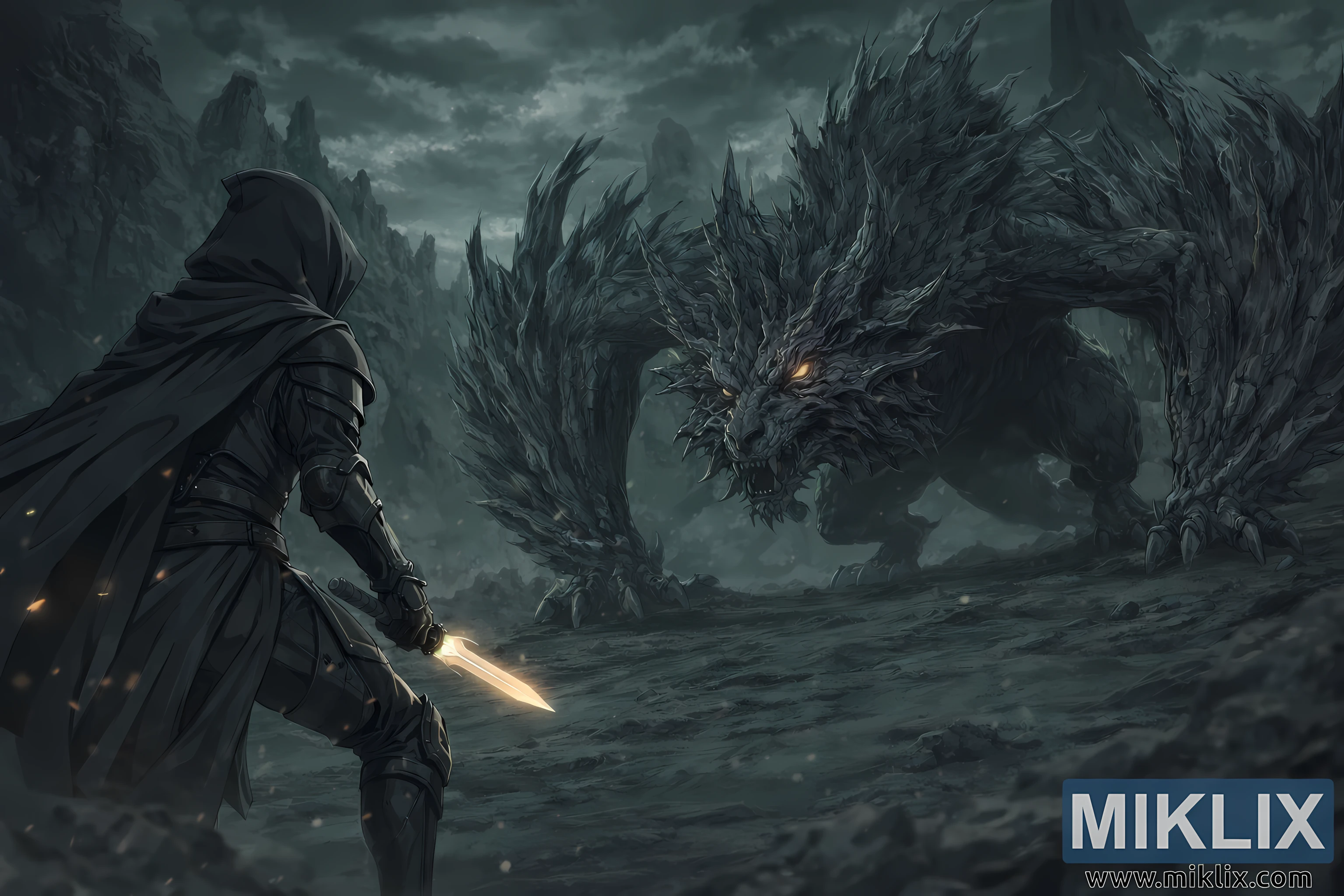 The composition emphasizes the confrontation: the Tarnished and the beast are positioned on opposing sides of the frame, separated by a short stretch of barren ground that feels charged with anticipation. The subdued color scheme—dominated by dark grays, greens, and blacks—reinforces the grim tone of the world, while the small points of warm light from the dagger and the beast’s eyes heighten the drama. Overall, the image captures a powerful narrative moment of resolve and menace, embodying the themes of isolation, danger, and quiet determination that define the Elden Ring universe.