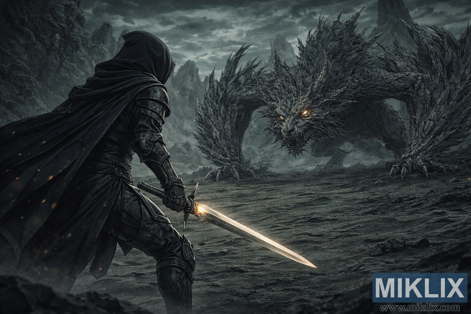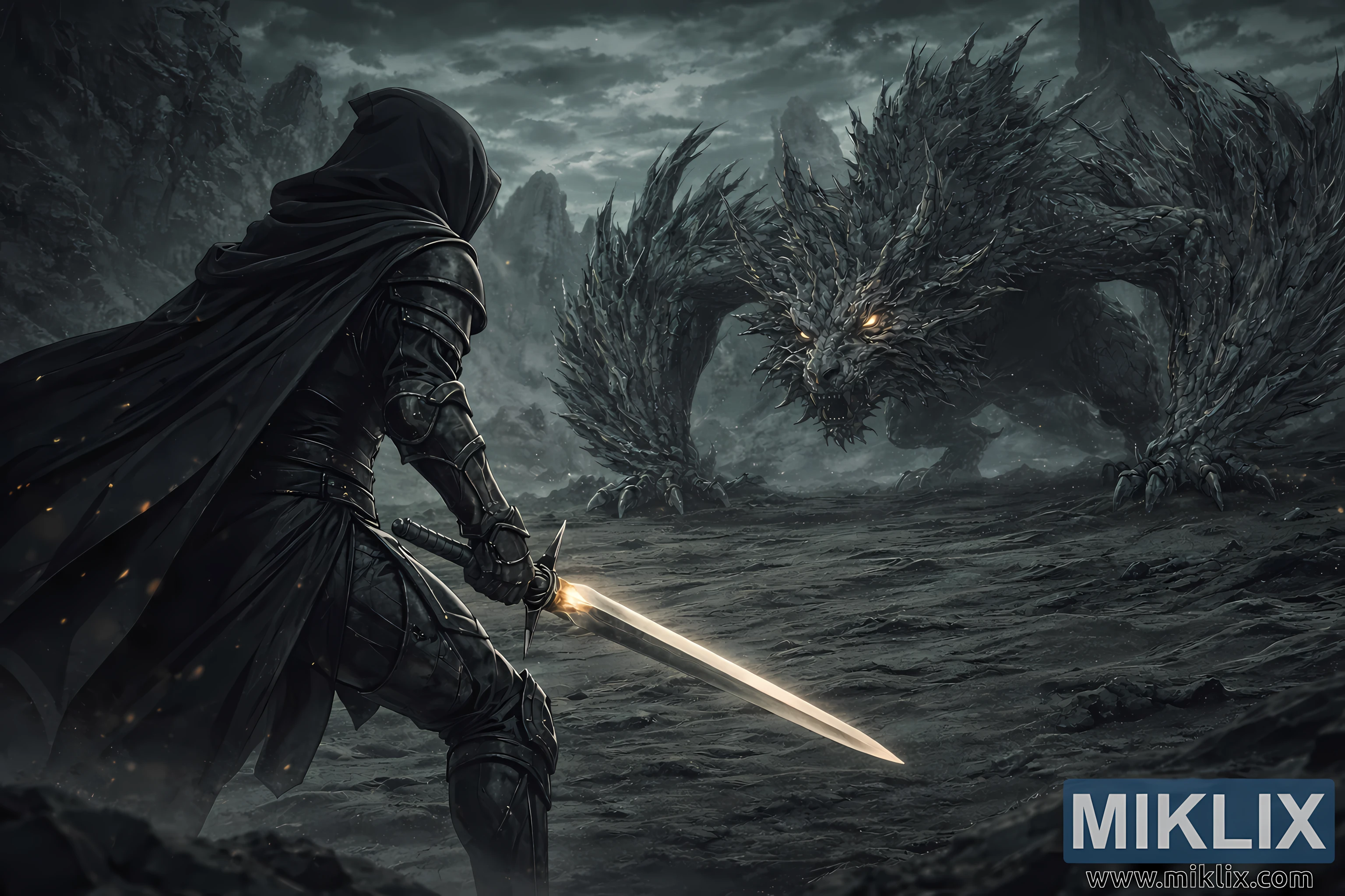The image captures a dramatic, anime-style moment inspired by Elden Ring: Shadow of the Erdtree, frozen at the precise instant before combat erupts. The viewpoint is positioned behind and slightly to the left of the Tarnished, placing the viewer directly in the warrior’s perspective as they confront an overwhelming foe. The Tarnished occupies the left side of the frame, partially seen from behind, their posture tense and grounded. They wear the Black Knife armor, rendered in deep blacks and dark grays, with layered plates, reinforced joints, and subtle metallic highlights that catch the dim, ambient light. A heavy black cloak flows from their shoulders, its fabric rippling slightly as if stirred by a cold wind sweeping across the barren terrain.