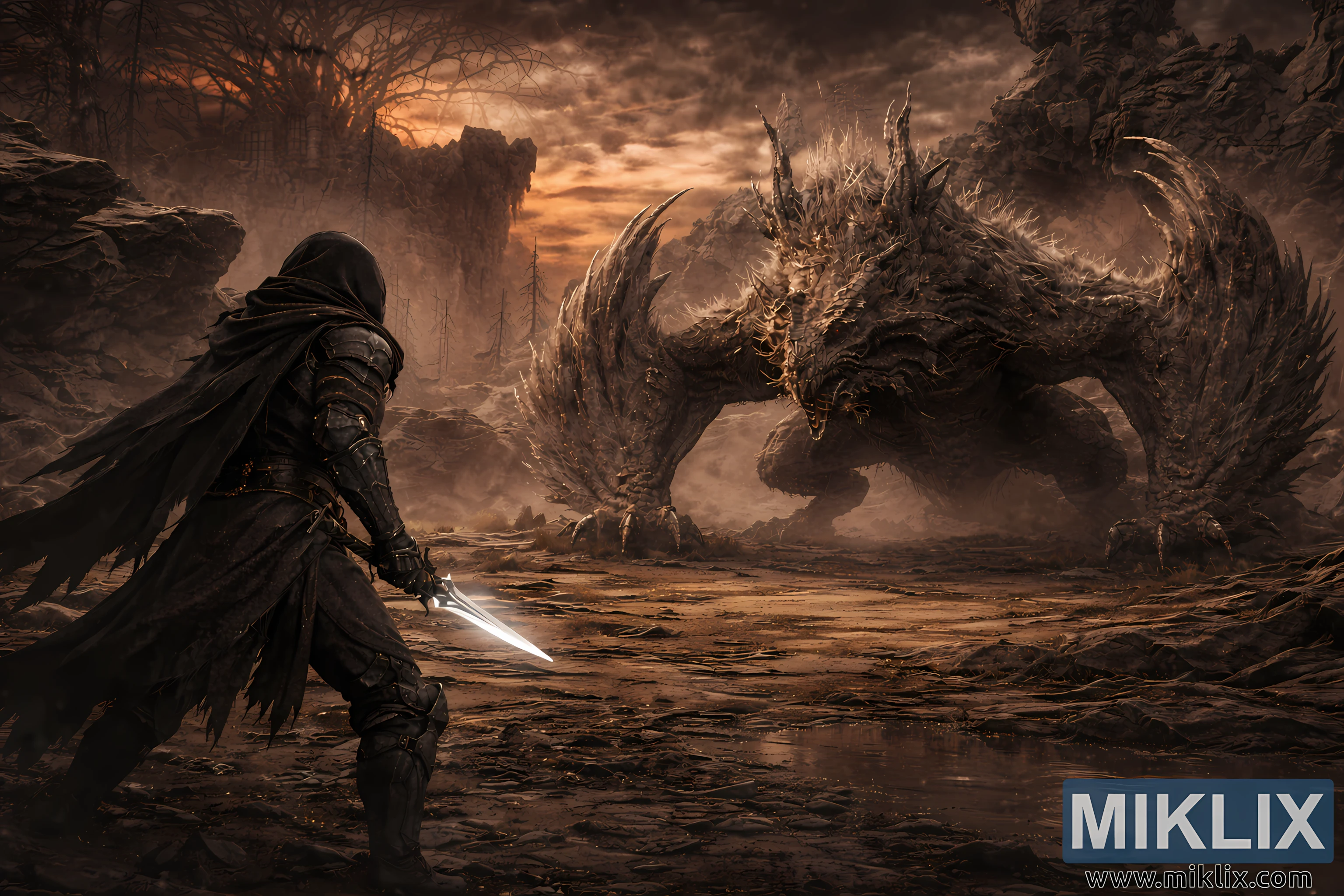 The broader environment plays a significant role in the scene. The ground stretches outward in cracked plates of earth, scattered with shallow puddles that reflect the dim sky. Sparse, dead vegetation clings to life among rocks and debris. In the midground and background, towering cliffs and massive stone formations rise into twisted arches and fractured walls, suggesting ancient ruin or geological violence. Farther back, the silhouette of gnarled, lifeless trees and distant rock spires adds depth and scale.