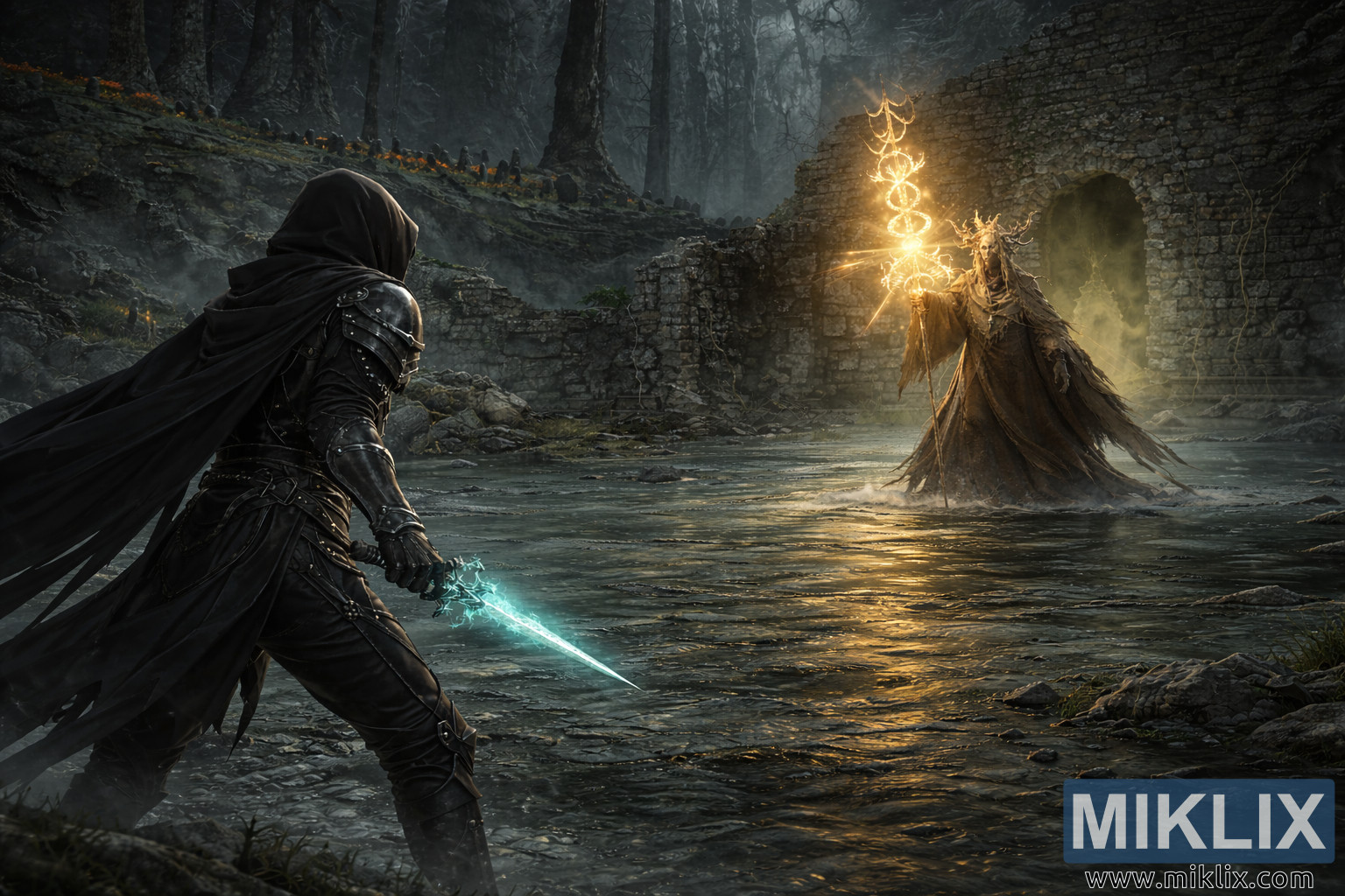 The expanded view allows the lighting to play a central role in the scene. Cool, desaturated tones dominate the catacombs and the Tarnished’s armor and weapon, while the warm, radiant gold of Jori’s staff acts as a striking focal point. These opposing color temperatures meet and blend across the water’s reflective surface, creating a visual tension that mirrors the emotional standoff between the two figures. Neither combatant has yet attacked; instead, they approach one another warily, measuring distance, intent, and strength. The image captures a suspended moment just before violence erupts, where silence, anticipation, and the weight of an inevitable boss battle linger heavily in the ancient, flooded depths of the Darklight Catacombs.