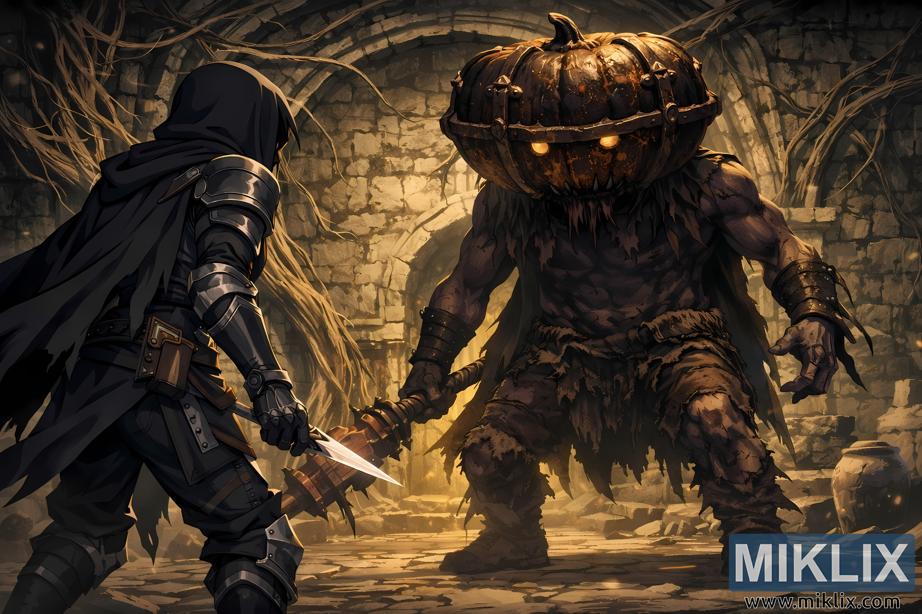 An atmospheric anime-inspired digital illustration depicts a tense pre-battle confrontation inside the crumbling stone halls of the Waypoint Ruins. The scene is set in a dim, ancient underground chamber illuminated by warm shafts of golden light filtering through cracks in the ceiling, mixing with drifting dust and thin layers of mist that hug the floor. Weathered stone arches frame the background, their surfaces etched with age, vines, and fractured masonry that hint at forgotten civilizations and long-abandoned rituals. In the left foreground stands the Tarnished, clad in sleek Black Knife–style armor rendered with smooth, dark metallic tones and subtle reflective highlights. The armor’s contours are elegant yet practical, emphasizing agility and stealth rather than brute strength. A deep hood partially obscures the character’s face, casting soft shadows that enhance the mysterious aura. The Tarnished’s posture is low and cautious, one foot slightly forward, shoulders angled defensively, and a short glowing dagger held in a reverse grip while a compact shield rests near the opposite arm. Faint bluish reflections shimmer along the blade’s edge, contrasting against the warm ambient lighting of the ruins. Opposite the Tarnished, dominating the right side of the composition, looms the Mad Pumpkin Head boss. The creature’s massive, rust-streaked pumpkin helmet is scarred and dented, with narrow eye slits emitting an eerie amber glow. Thick iron bands wrap around the helmet, secured by heavy rivets that add a sense of oppressive weight. Beneath the oversized headpiece, the boss’s muscular torso is bare except for tattered cloth wrappings and worn leather straps, each detail textured to emphasize grime, age, and battle damage. One massive hand grips a crude spiked weapon, its metal head chipped and stained, while the other hand hangs slightly open as if preparing to lunge. The creature’s stance is wide and grounded, conveying raw strength and imminent aggression. The composition captures the precise moment before combat begins: both figures lean subtly toward each other, separated by only a few meters of cracked stone floor scattered with debris and broken pottery. The lighting plays a dramatic role, casting elongated shadows behind both characters and creating a visual corridor that draws the viewer’s eye to the space between them. Warm golden highlights outline the Pumpkin Head’s silhouette, while cooler, muted reflections trace the Tarnished’s armor, reinforcing the thematic contrast between brute force and calculated precision. Fine environmental details—loose roots dangling from the ceiling, chipped pillars, drifting motes of dust, and faint fog swirling around their feet—contribute to a sense of ancient danger and suspended time. The overall color palette blends earthy browns, muted grays, and dark metallic blues, punctuated by the glowing eyes of the boss and the faint luminescence of the Tarnished’s weapon. The anime art style softens certain edges while preserving intricate textures, resulting in a balance between stylized character design and richly detailed environmental storytelling. The mood is tense, cinematic, and anticipatory, freezing a heartbeat of silence before chaos erupts, inviting the viewer to imagine the clash that is about to unfold.