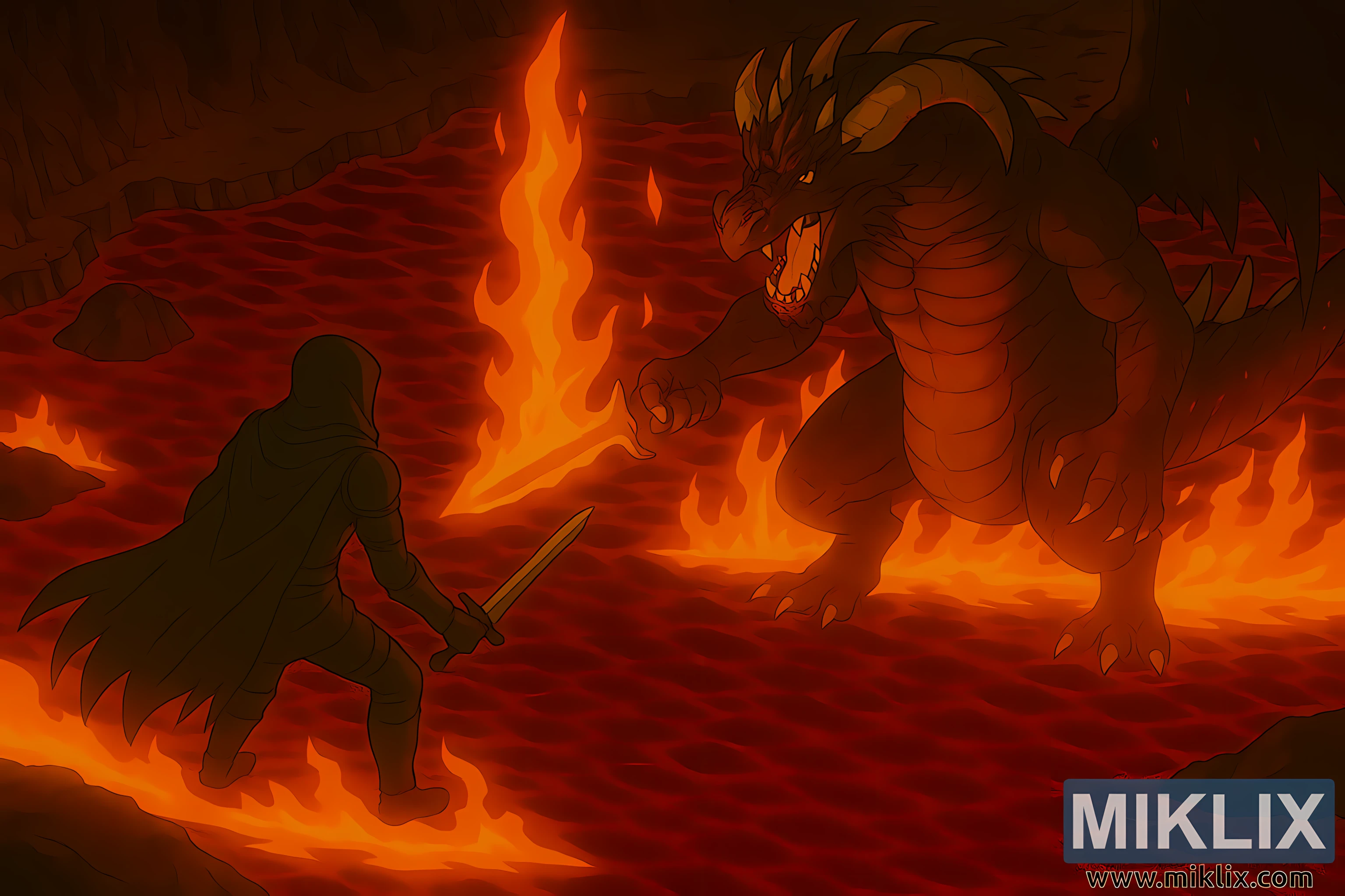 Opposite him towers the Magma Wyrm, a colossal draconic creature with a serpentine body covered in jagged, volcanic scales. Its underbelly glows with molten orange cracks, pulsing with heat. The wyrm’s head is adorned with curved horns and glowing yellow eyes that burn with fury. Its mouth is open in a roar, revealing rows of jagged teeth and a flickering lava tongue. In its right claw, the wyrm wields an oversized flaming sword—its blade engulfed in roaring fire, extending high above its head and casting intense orange and yellow light across the battlefield.
