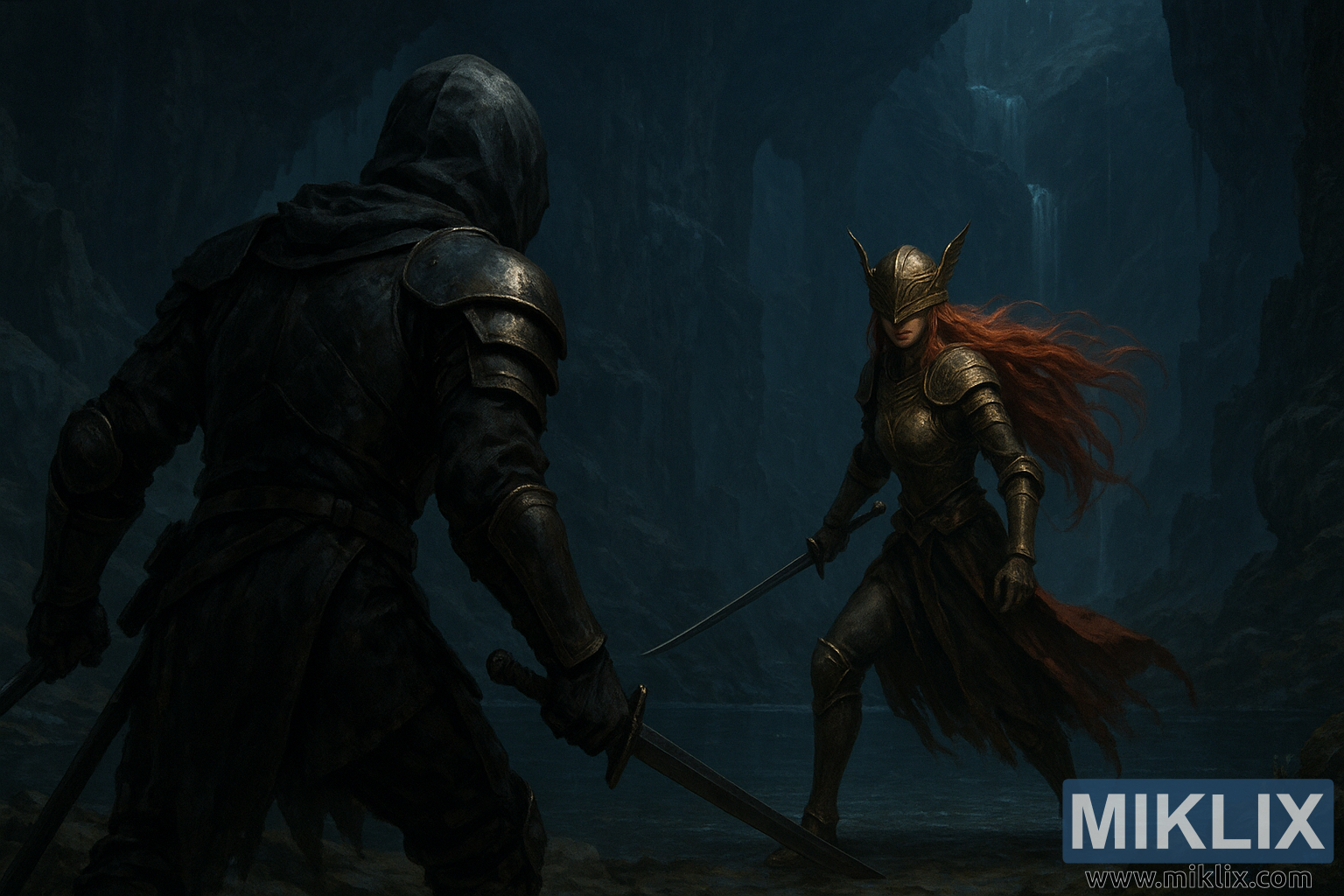 Image: Malenia Confronts the Black Knife Assassin in the Deep Cavern