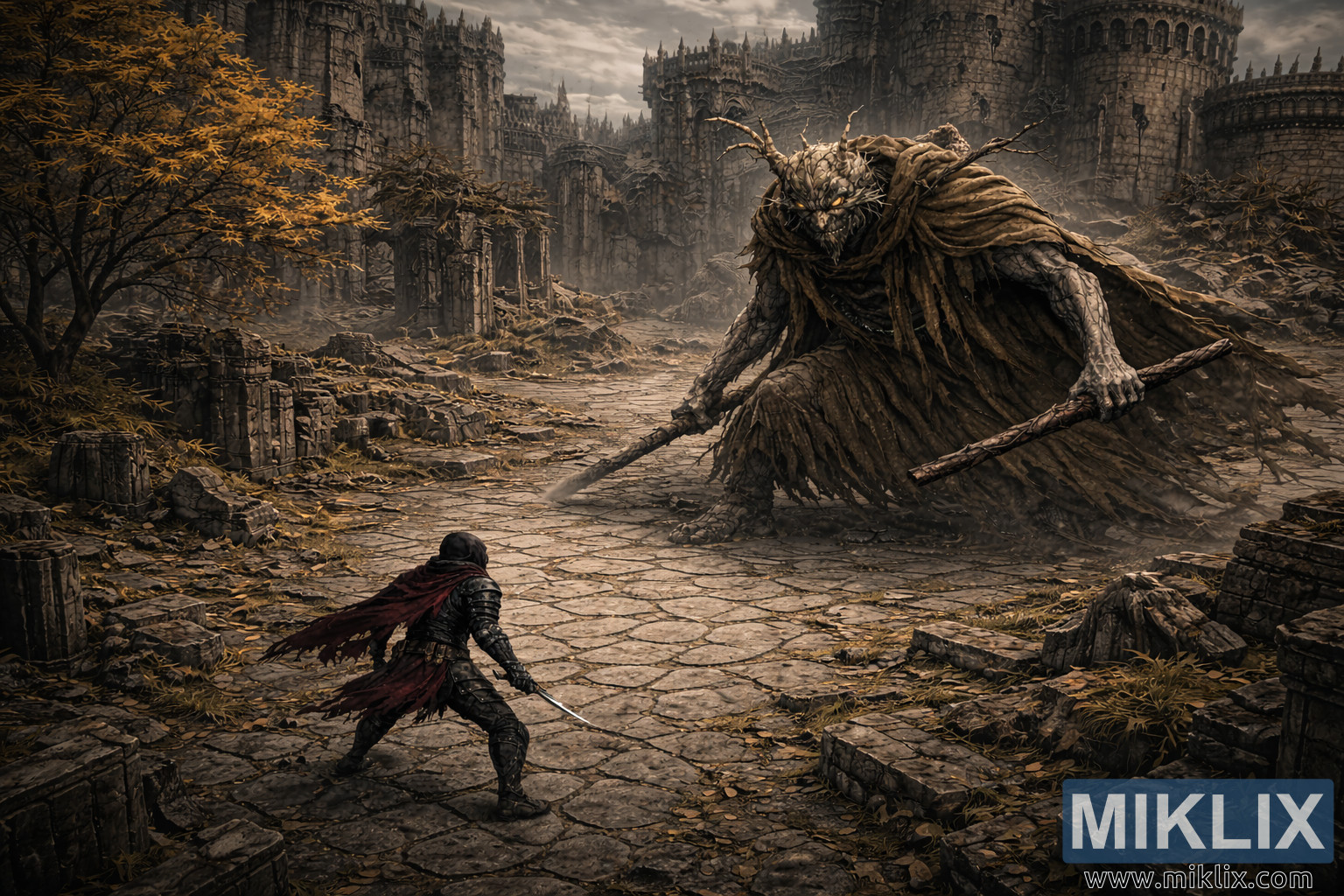 The broadened isometric view reveals an intricately detailed environment. Cracked flagstones form uneven geometric paths across the courtyard, interspersed with broken pillars, scattered rubble, creeping moss, and fallen leaves. To the left mid-ground, a solitary tree with golden autumn foliage introduces warmth and visual balance against the fortress’s cold austerity. Beyond the confrontation, towering gothic walls, spires, and arched facades rise in layered depth, softened by atmospheric haze and distance. Fine dust and drifting debris animate the air, suggesting restless wind through abandoned ruins. Soft yet directional lighting outlines armor edges, horn ridges, and fabric folds while allowing recesses to fall into deep shadow. The overall mood is tense, grounded, and cinematic, capturing the suspended heartbeat before violence erupts while the elevated landscape perspective amplifies the sense of scale, isolation, and impending confrontation within a decaying, monumental world.