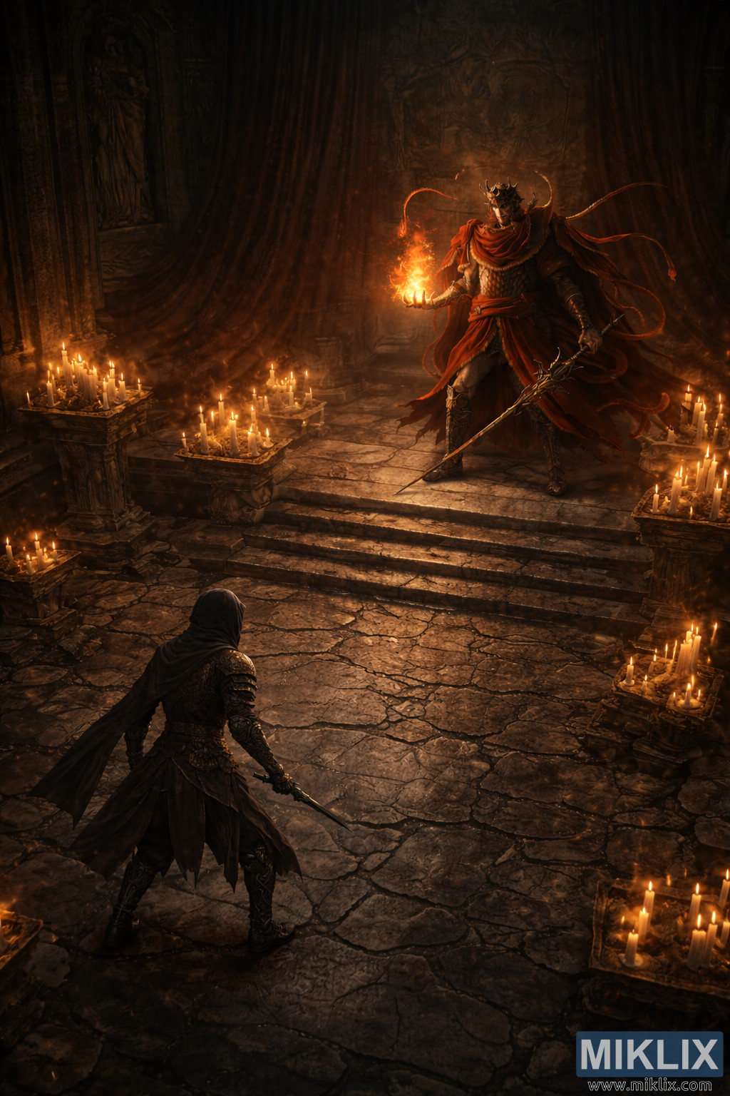 Messmer’s right hand is held open, conjuring a living flame that burns bright and volatile in his palm. From above, the fire casts a broad halo of light across the platform, steps, and nearby candles, projecting long, distorted shadows that emphasize the height difference between the two figures. In his left hand, he grips an ornate spear angled toward the floor, its metal reflecting sharp streaks of firelight. The flame feels controlled yet dangerous, suggesting immense power held in reserve.