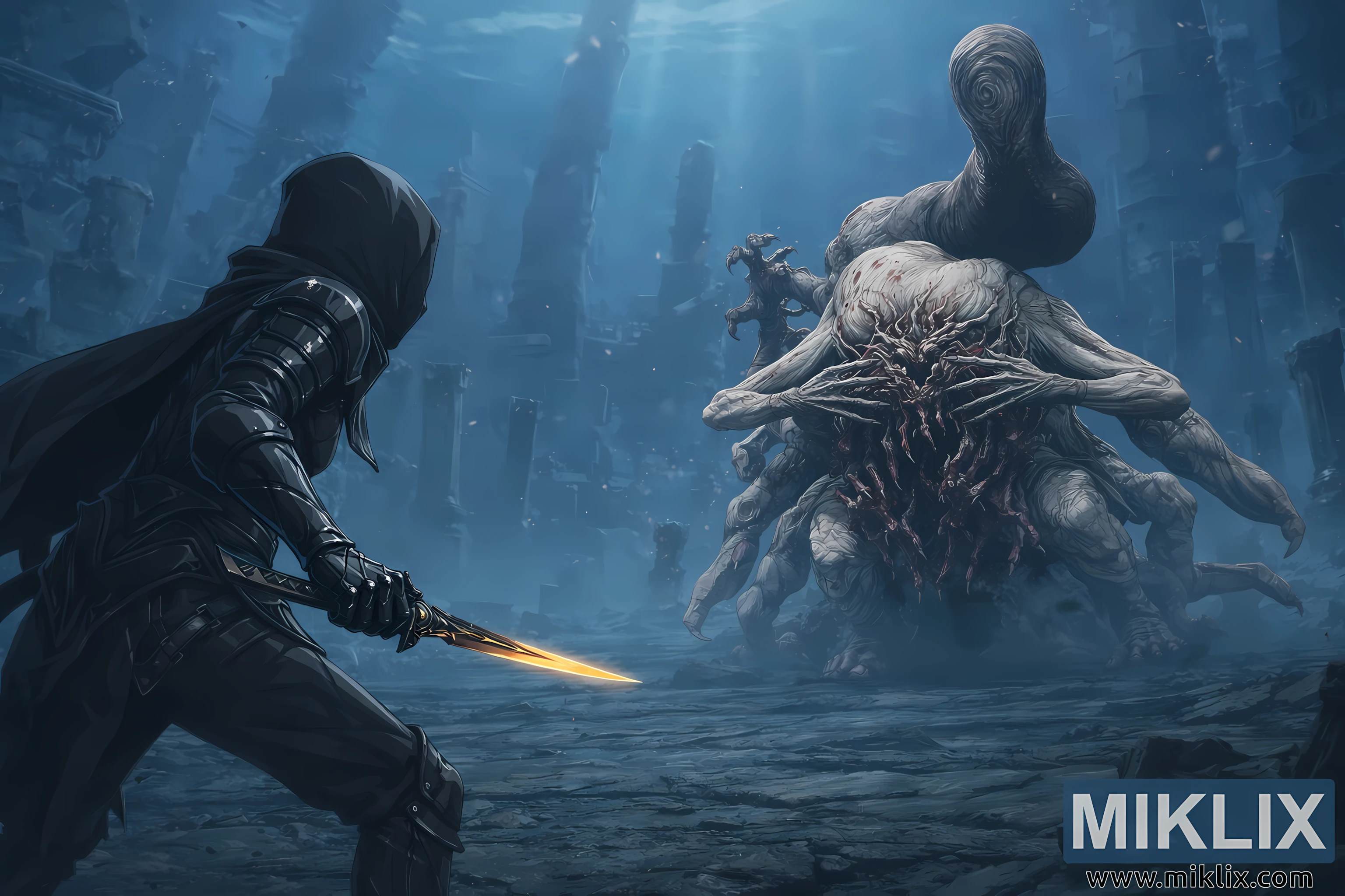 Opposite the Tarnished, dominating the right side of the composition, looms Metyr, Mother of Fingers. The boss’s grotesque, otherworldly form is rendered with unsettling detail: a massive, pale, fleshy body supported by multiple finger-like limbs that spread outward and downward, pressing into the stone floor like grasping roots. From its upper mass rises a thick, elongated appendage resembling a colossal finger or coiled spine, curling upward into the water-darkened air. At the center of its torso, tangled cords of sinew and flesh twist and knot together, suggesting both a malformed heart and a blasphemous altar of living tissue. The texture of Metyr’s body appears slick and organic, with subtle veins and folds catching the dim light, giving the impression that it is breathing or slowly shifting even in stillness.