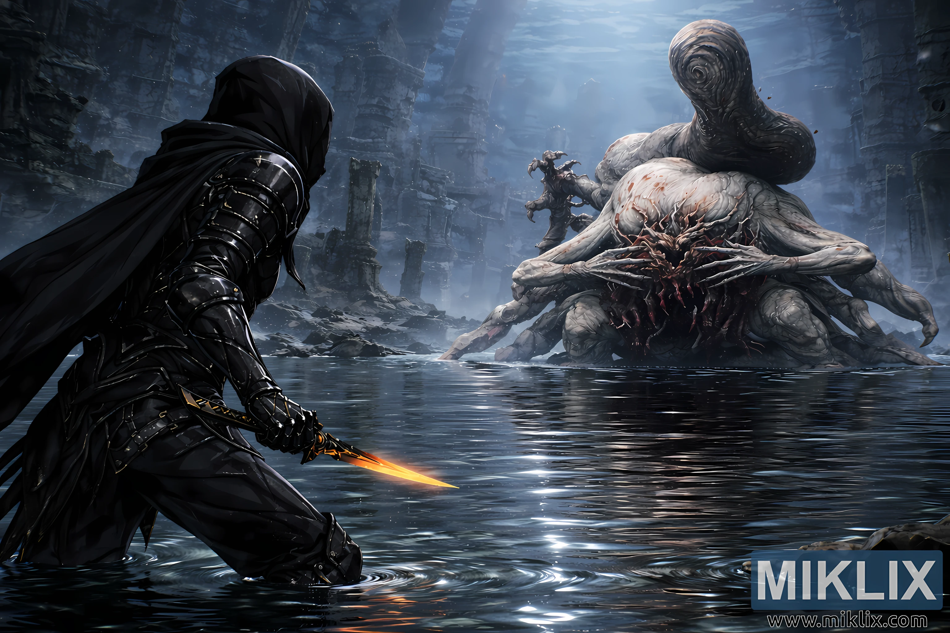 Dominating the right side of the composition is Metyr, Mother of Fingers, now rendered at a vastly larger scale. The boss’s massive, grotesque form rises from the flooded floor like a living monument. Its pale, fleshy body is supported by multiple thick, finger-like limbs that spread outward and press into the submerged stone, displacing large volumes of water and creating overlapping rings of ripples. Above its bulk rises a colossal, elongated appendage resembling an immense finger or twisted spine, curling upward into the dim, light-filled air. At the center of Metyr’s torso lies a dense knot of sinew, tendons, and malformed flesh, forming a disturbing focal point that suggests both a corrupted heart and an unholy nexus of control. Moisture clings to its skin, highlighting veins, folds, and organic textures that give the impression of slow, unsettling movement even in stillness.