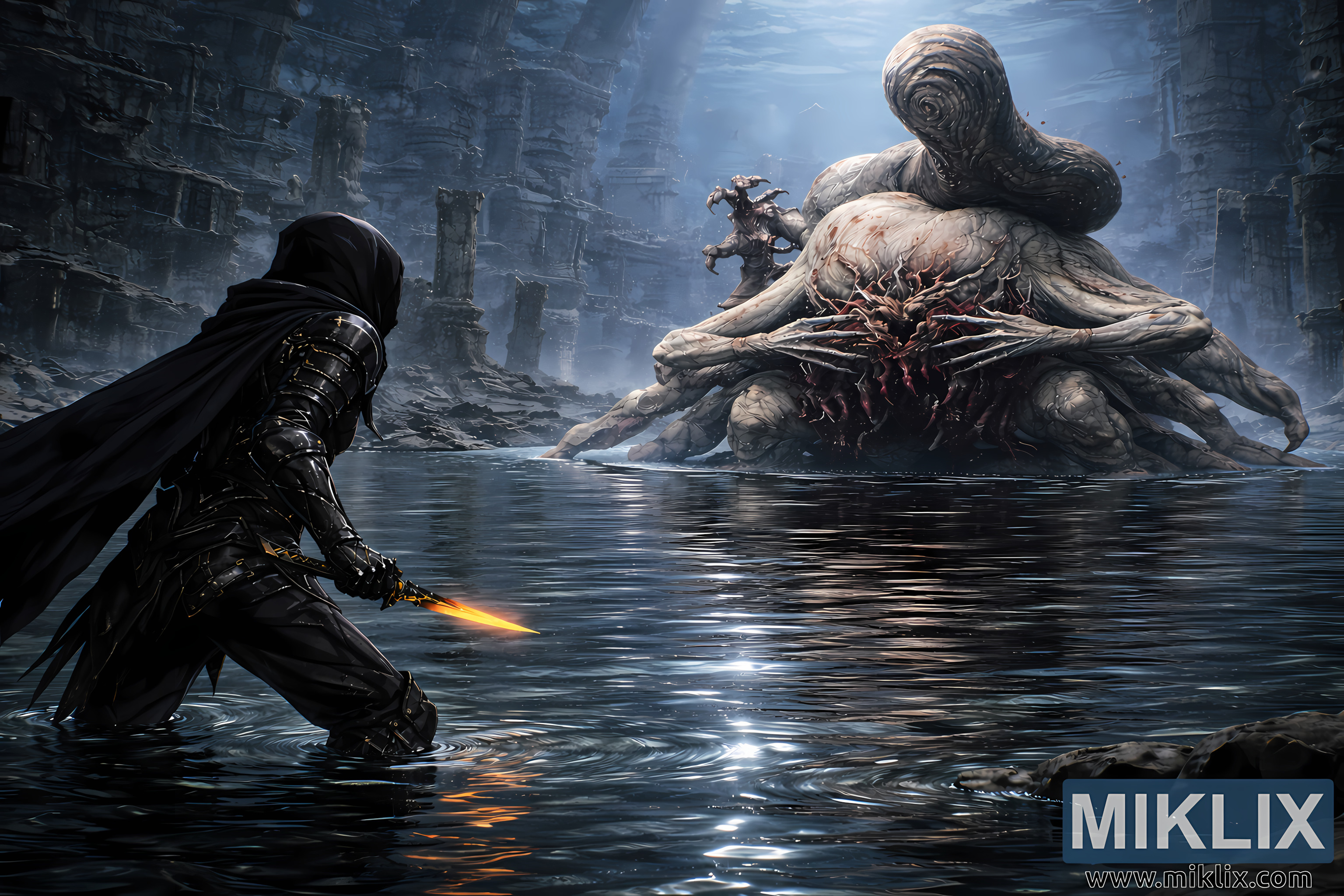 Dominating the right side of the composition—and now far closer to the Tarnished—looms Metyr, Mother of Fingers. The boss’s immense, grotesque form fills much of the frame, creating a sense of overwhelming proximity and imminent danger. Its pale, fleshy body rises heavily from the flooded floor, supported by multiple thick, finger-like limbs that spread outward beneath the water’s surface. These massive appendages displace large volumes of water, generating broad, overlapping ripples that collide with those caused by the Tarnished’s movements. From Metyr’s upper mass rises a colossal, elongated appendage resembling an enormous finger or twisted spine, curling upward into the blue-lit air. At the center of its torso, a dense knot of sinew, tendons, and malformed flesh forms a disturbing focal point, evoking the impression of a corrupted heart or unholy core. Moisture clings to its skin, accentuating veins, folds, and organic textures that suggest slow, unsettling motion even as the creature holds still.