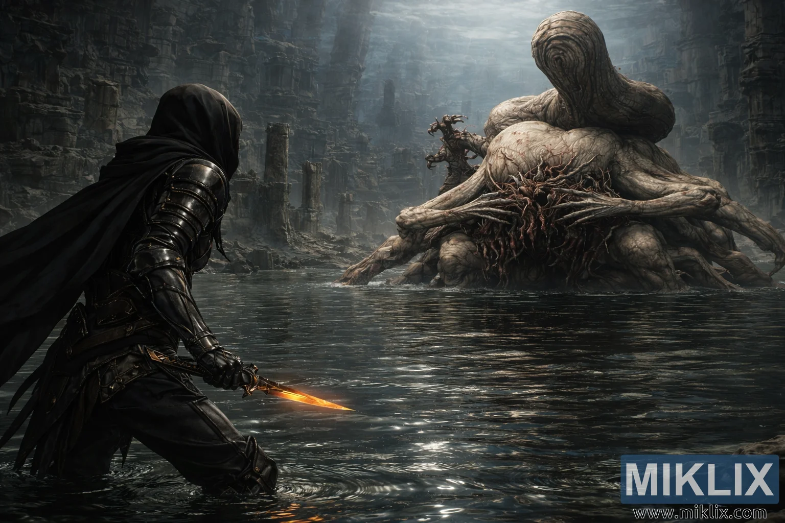Dark, realistic Elden Ring fan art depicting the Tarnished confronting the colossal Metyr, Mother of Fingers, at close range across a shallow, water-covered floor in the Finger Ruins of Miyr.