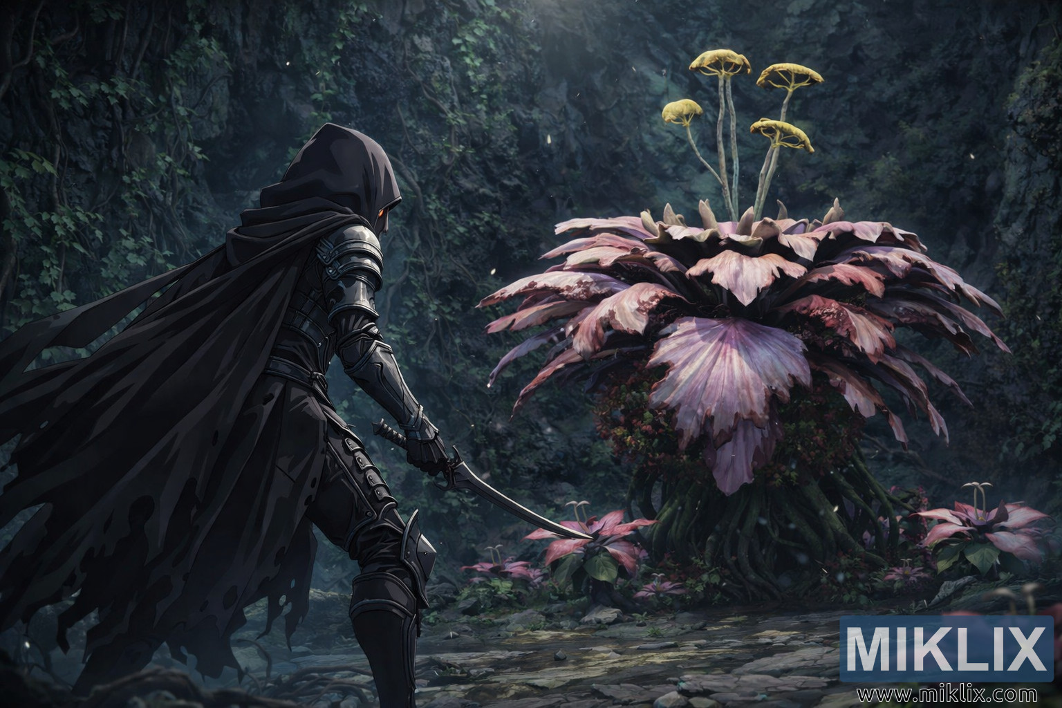 High-resolution anime-inspired fan art depicting the Tarnished in Black Knife armor confronting the Miranda Blossom boss in Elden Ring’s Tombsward Cave, capturing the tense calm before combat.