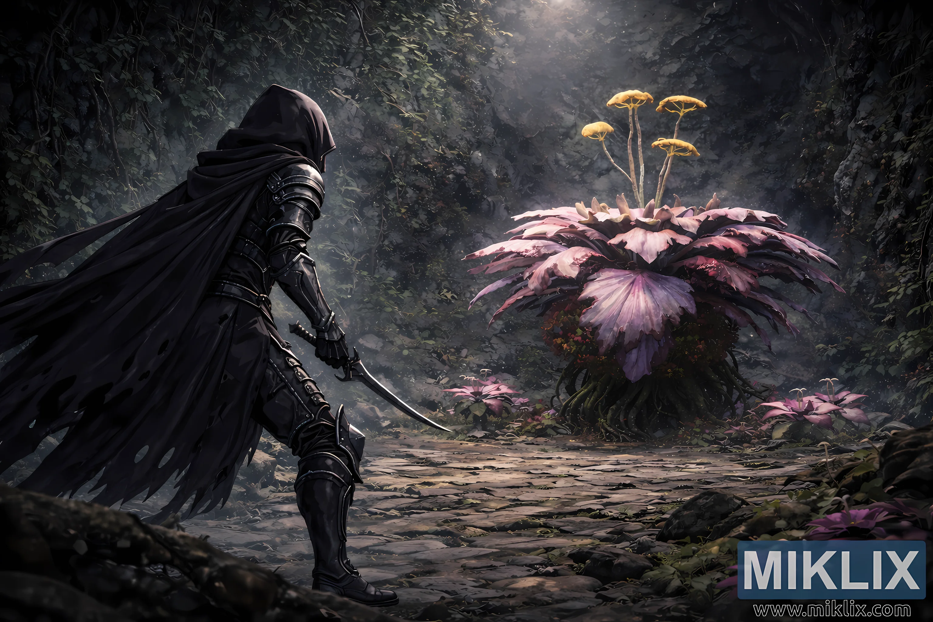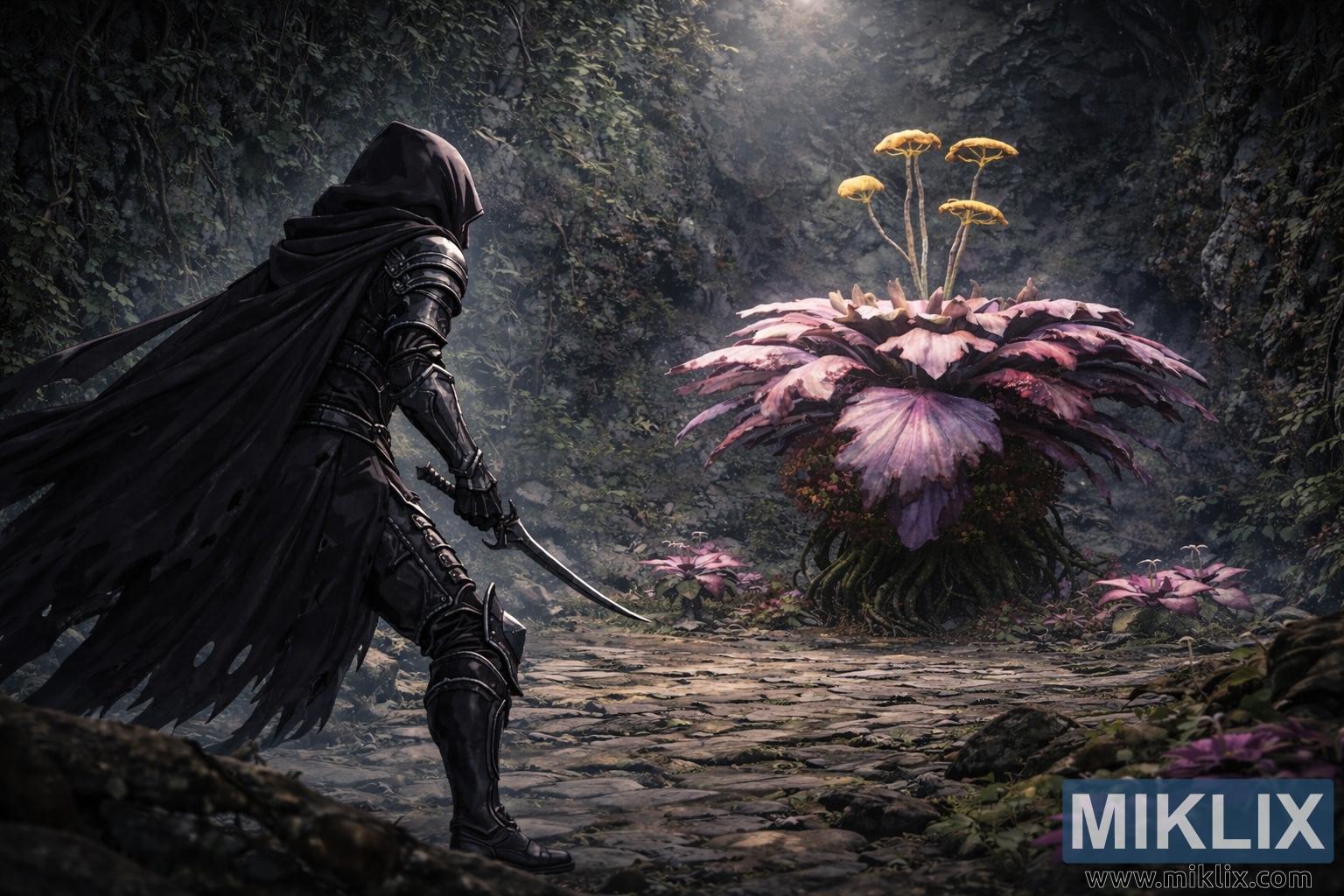 The overall mood of the image is one of suspended anticipation amplified by the broader view. The added background space heightens the silence and tension, making the distance between the Tarnished and the Miranda Blossom feel deliberate and significant. Nothing has moved yet, and no attack has begun, but the scene feels charged with inevitability. The composition captures the precise moment before violence erupts, blending haunting beauty, environmental storytelling, and restrained motion to embody the atmosphere and emotional weight of an Elden Ring encounter.