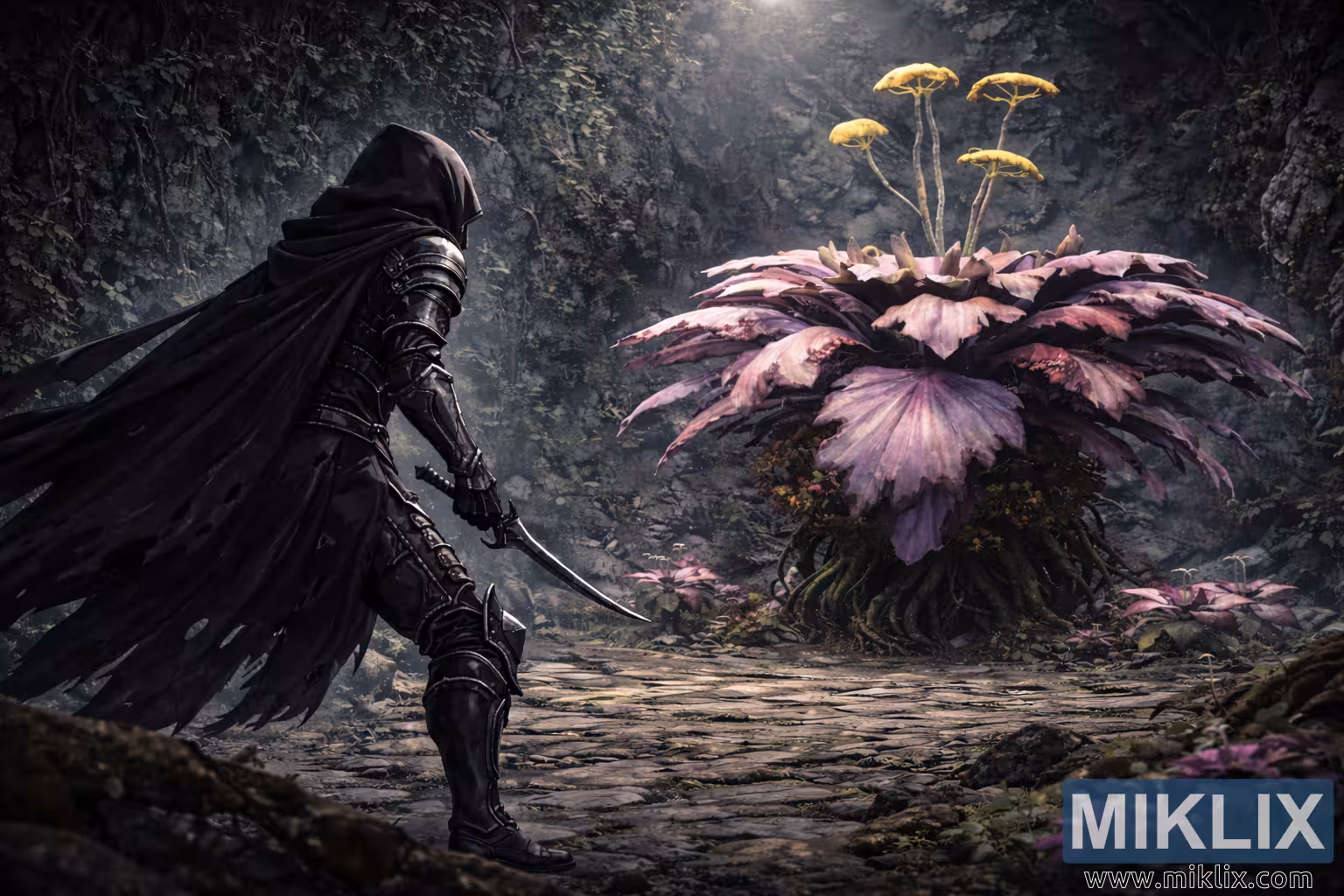 Dominating the right side of the composition is the Miranda Blossom boss, now noticeably larger and more imposing. The creature rises from the cave floor as a massive fusion of plant and monster, its thick, root-like base spreading outward and gripping the stone beneath it. Broad, layered petals fan outward in muted shades of pink, mauve, and dusty purple, each petal textured with organic veins and slightly ragged, uneven edges. The increased scale makes the blossom feel heavy and overwhelming, as if it could engulf the Tarnished with a single movement. From the center of the flower, several tall, slender stalks stretch upward, each crowned with pale yellow, mushroom-like caps that emit a soft, eerie glow. These glowing caps draw the eye upward and hint at the poisonous spores and hidden dangers the creature is capable of unleashing.