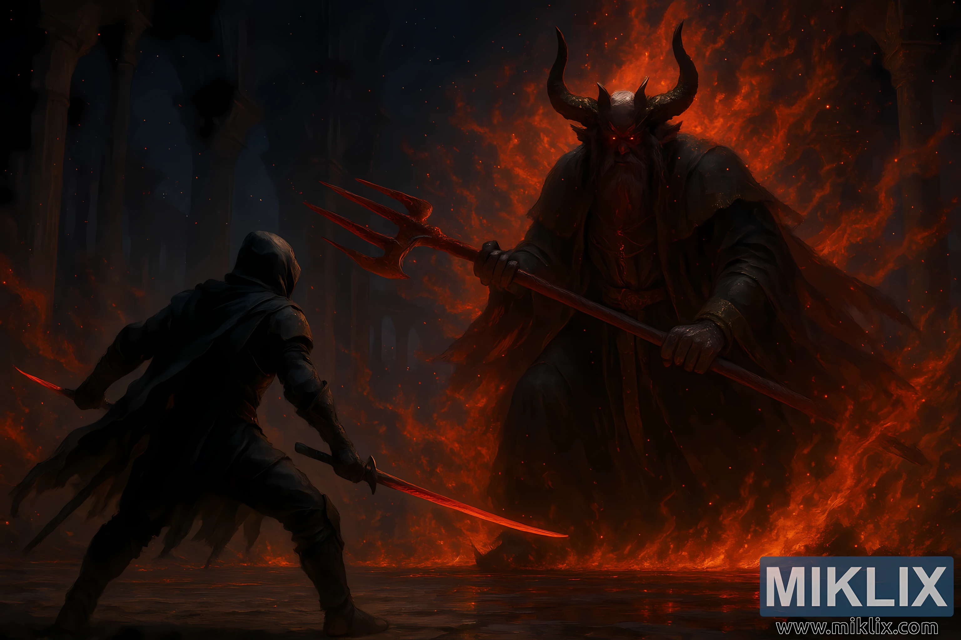 A dark fantasy scene of a warrior confronting Mohg, Lord of Blood, in a fiery cathedral environment, featuring twin blades and a massive trident.